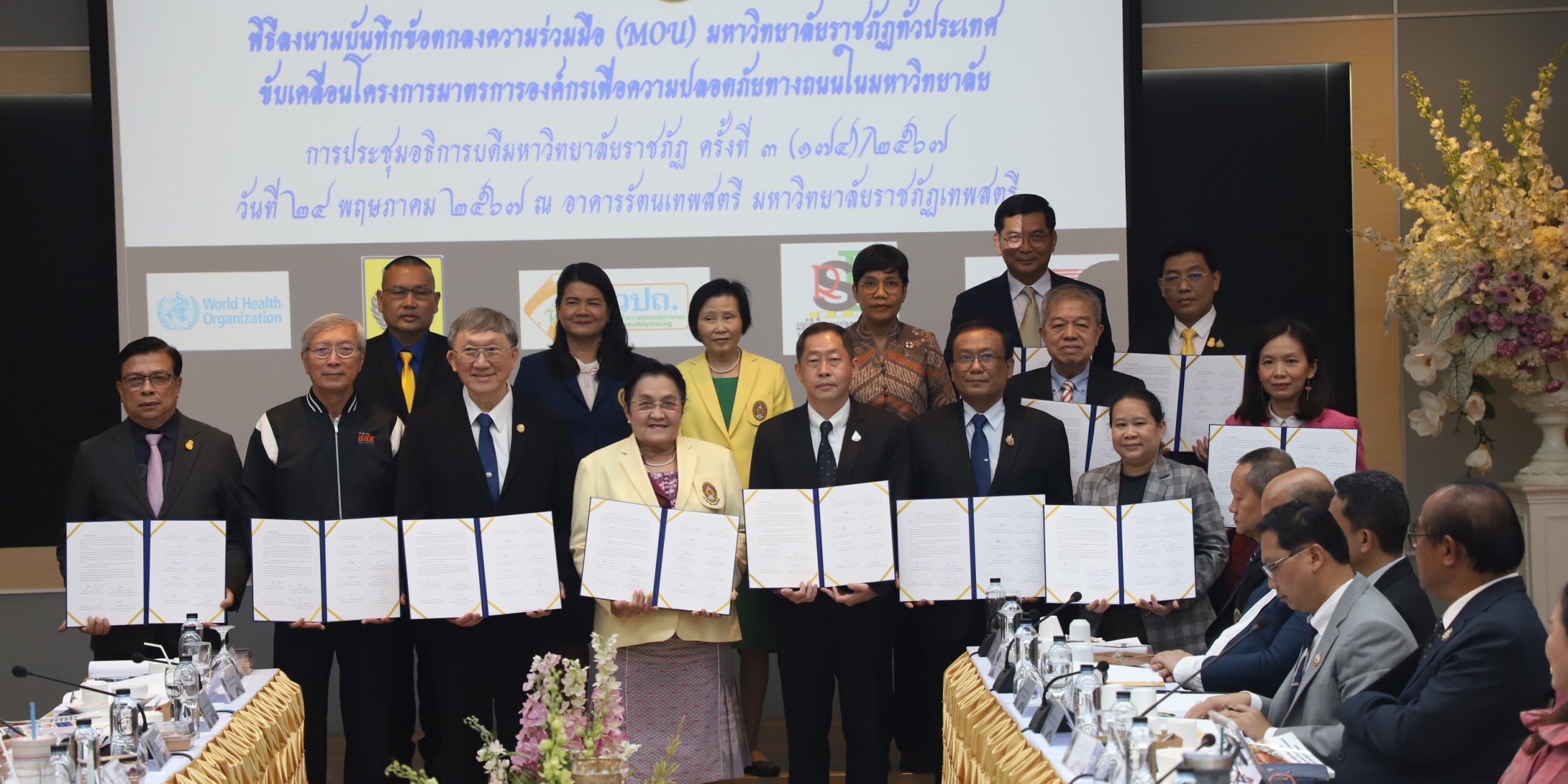 ในโอกาสเดียวกันนี้ได้มีพิธีลงนามความร่วมมือ (MOU) มหาวิทยาลัยราชภัฏทั่วประเทศ เพื่อขับเคลื่อน “โครงการมาตรการองค์กรเพื่อความปลอดภัยทางถนนในมหาวิทยาลัย” ระหว่าง มหาวิทยาลัยราชภัฏทั่วประเทศ กับ กองทุนสนับสนุนการเสริมสร้างสุขภาพ (สสส.) โดยมีสาระสำคัญตามบันทึกลงนามเพื่อสร้างเครือข่ายความร่วมมือของสถาบันอุดมศึกษาของมหาวิทยาลัยราชภัฏทั่วประเทศทั้ง 38 แห่ง กับกองทุนสนับสนุนการเสริมสร้างสุขภาพ (สสส.) โดยมีเป้าหมายเพื่อขับเคลื่อนองค์กรตามมาตรการความปลอดภัยทางถนนในมหาวิทยาลัย และเพื่อลดจำนวนการเสียชีวิตและบาดเจ็บจากอุบัติเหตุทางถนน รวมถึงเป็นแนวทางป้องกัน สร้างความตระหนัก ความมีวินัย และสร้างการมีส่วนร่วมของนักศึกษาและบุคลากรให้ปฏิบัติตามกฎ ระเบียบ มาตรการความปลอดภัยทางถนนในมหาวิทยาลัย เพื่อช่วยลดการสูญเสียอันเกิดจากอุบัติเหตุทางถนน