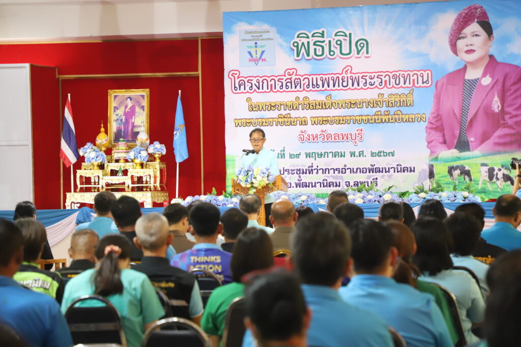 วันที่ 29 พฤษภาคม 2567 เวลา 10.00 น. ณ หอประชุมที่ว่าการอำเภอพัฒนานิคม อำเภอพัฒนานิคม จังหวัดลพบุรี นายสัตวแพทย์ประภาส ภิญโญชีพ รองอธิบดีกรมปศุสัตว์ เป็นประธานเปิดโครงการสัตวแพทย์พระราชทานในพระราชดำริสมเด็จพระนางเจ้าสิริกิติ์ พระบรมราชินีนาถพระบรมราชชนนี พันปีหลวง โดยมี นายวชิระ เกตุพันธุ์ รองผู้ว่าราชการจังหวัดลพบุรี พร้อมด้วย นายสัตวแพทย์จรูญ ชูเกียรติวัฒนา ปศุสัตว์จังหวัดลพบุรี นายธนณัฐ อาจิณกิจ นายอำเภอพัฒนานิคมคณะกรรมการโครงการสัตวแพทย์พระราชทาน หัวหน้าส่วนราชการ คณาจารย์ นิสิต นักศึกษา ผู้นำท้องที่ ผู้นำ ท้องถิ่น พี่น้องเกษตรกรผู้เลี้ยงสัตว์ เข้าร่วมพิธี