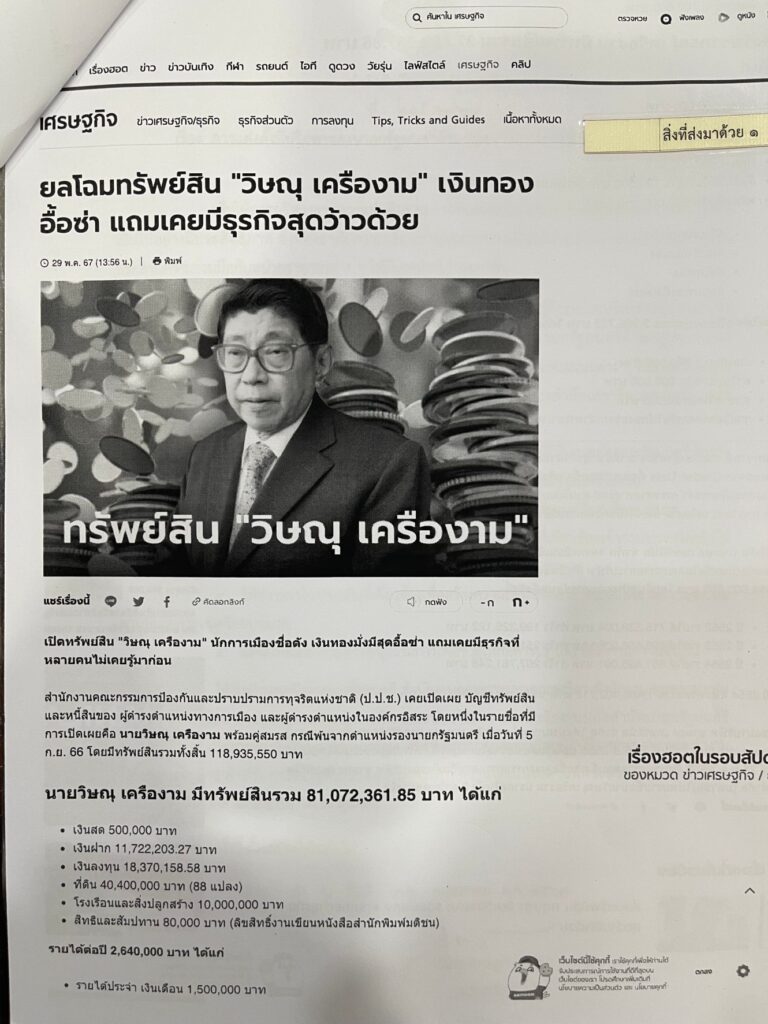 ทั้งนี้ พี่น้องประชาชนให้ข้าพเจ้าร้องเรียนกับสำนักงาน ป.ป.ช. เพื่อตรวจสอบว่าเหตุใด นายวิษณุ เครืองาม รับราชการปกติ ลำพังเงินเดือนทางราชการหรือเบี้ยประชุมหรือเงินจากทางราชการจะร่ำรวยมากมายขนาดนี้หรือ โดยส่วนตัวข้าพเจ้าเชื่อว่าท่านสุจริต ไม่ได้ว่าท่านทุจริต เพียงแต่พี่น้องประชาชนมีข้อเคลือบแคลงสงสัย ดังนั้นเพื่อปฏิบัติตามกฎหมายจึงขอให้สำนักงาน ป.ป.ช. ตรวจสอบว่าร่ำรวยโดยปกติหรือไม่ ตามอำนาจหน้าที่และกฎหมาย ป.ป.ช. ต่อไป
