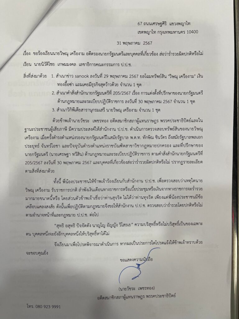 เมื่อวันที่ 31 พ.ค. 2567 นายวัชระ เพชรทอง อดีต สส. พรรคประชาธิปัตย์ ได้เดินทางไปยื่นหนังสือที่สำนักงาน ปปช. เรื่อง ขอร้องเรียน นายวิษณุ เครืองาม อดีตรองนายกรัฐมนตรีและบุคคลที่เกี่ยวข้อง ส่อว่าร่ำรวยผิดปกติหรือไม่ ถึง พล.ต.อ.วัชรพล ประสารราชกิจ ประธาน ปปช. ผ่านงานสารบรรณ สำนักงาน ปปช ในหนังสือร้องเรียนระบุว่า ในฐานะประชาชนผู้เสียภาษี มีความประสงค์ให้สำนักงาน ป.ป.ช. ดำเนินการตรวจสอบทรัพย์สินของ นายวิษณุ เครืองาม เมื่อครั้งดำรงตำแหน่งรองนายกรัฐมนตรีในสมัยรัฐบาล พ.ต.ท. ทักษิณ ชินวัตร ถึงสมัยรัฐบาล พลเอก ประยุทธ์ จันทร์โอชา และปัจจุบันดำรงตำแหน่งราชบัณฑิตสาขาวิชากฎหมายปกครอง และที่ปรึกษาของนายกรัฐมนตรี (นายเศรษฐา ทวีสิน) ด้านกฎหมายและระเบียบปฏิบัติราชการ ตามคำสั่งสำนักนายกรัฐมนตรีที่ 205/2567 ลงวันที่ 30 พฤษภาคม 2567 และบุคคลที่เกี่ยวข้องส่อว่าร่ำรวยผิดปกติหรือไม่ ซึ่งท่านแจ้งบัญชีทรัพย์สินเมื่อคราวพ้นตำแหน่งไว้ที่ปปช.จำนวน 118 ล้านบาทเศษ