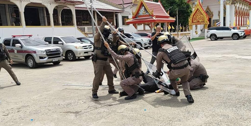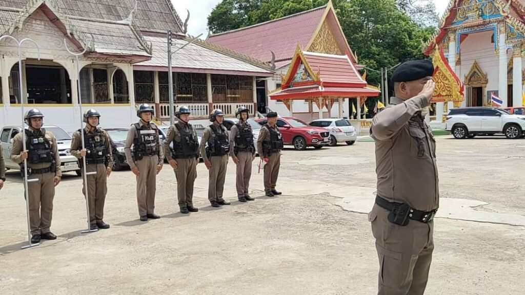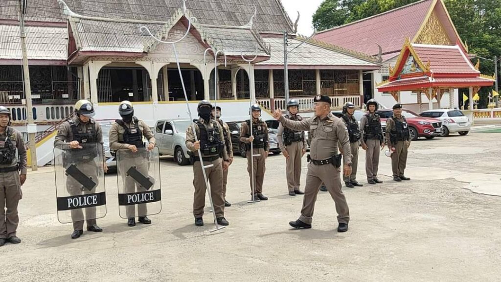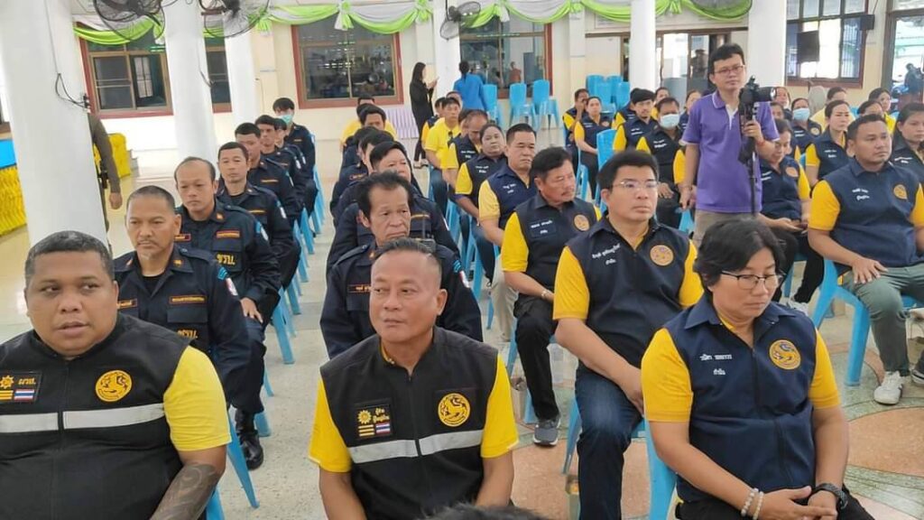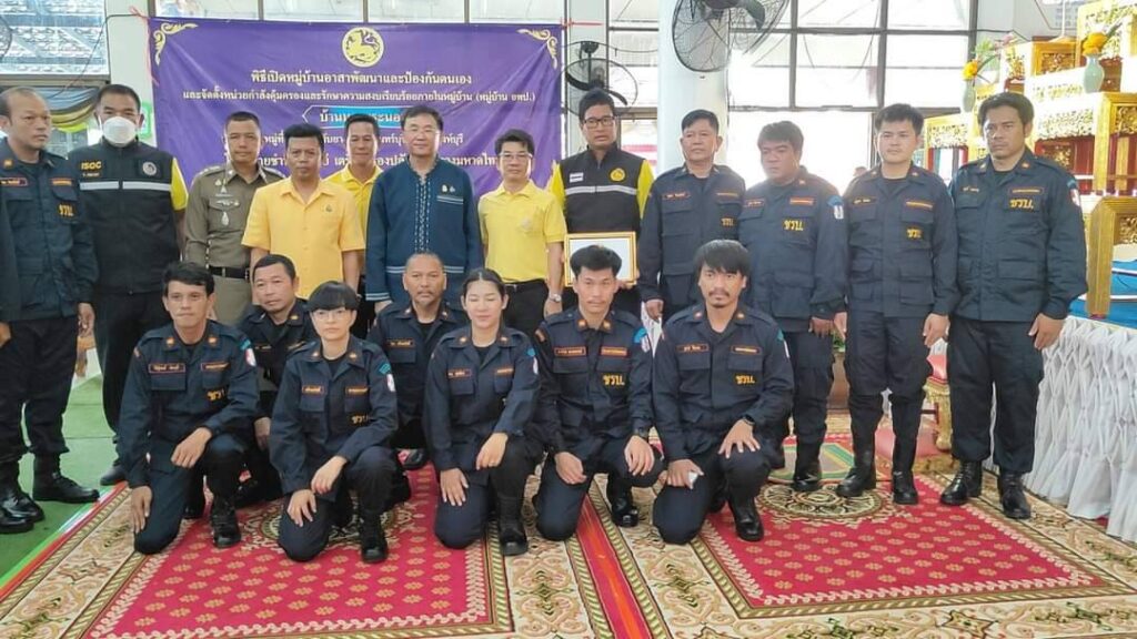 กำนัน ผู้ใหญ่เชนทร์ คนชาน หมู่ 1 ตำบลทับยา และสมาชิก อพป.หมุ่บ้าน ร่วมกิจกรรม รับมอบใบประกาศนียบัตรและบัตรประจำตัว ชุดรักษาความปลอดภัยหมู่บ้าน ชมการสาธิตยุทธวิธีระงับเหตุด้วยไม้ง่ามกับคนคลุ่มคลั่ง