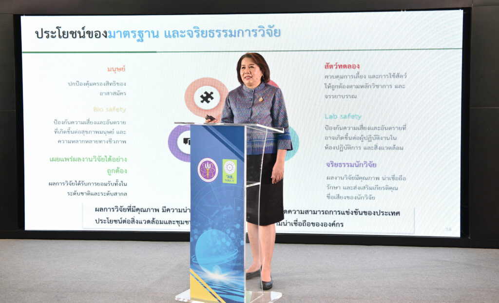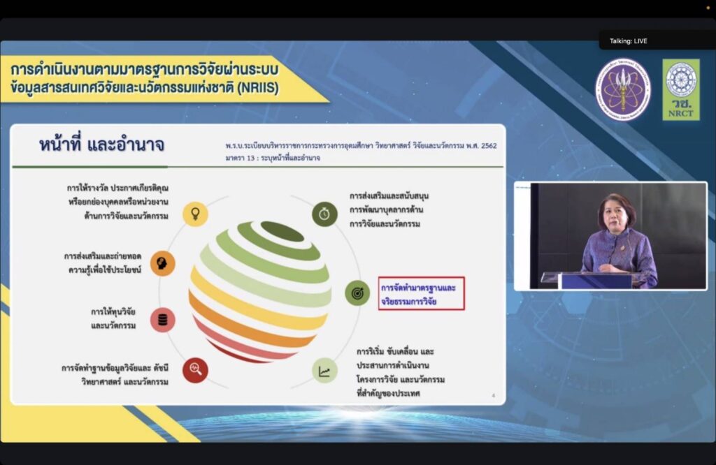 ดร.วิภารัตน์ ดีอ่อง ผู้อำนวยการสำนักงานการวิจัยแห่งชาติ (ผอ.วช.) กล่าวว่า (วช.) ได้จัดทำระบบข้อมูลสารสนเทศวิจัยและนวัตกรรมแห่งชาติ (NRIIS) เพื่อเป็นระบบกลางในการบริหารภาพรวมของการวิจัยและนวัตกรรม โครงการวิจัย นักวิจัย แผนงานวิจัย และโครงสร้างพื้นฐานของระบบวิจัย เป็นเครื่องมือในการเสนอขอรับงบประมาณจากกองทุนส่งเสริมวิทยาศาสตร์ วิจัยและนวัตกรรม (ววน.) และจากแหล่งทุนต่างๆ โดยการยื่นขอรับงบประมาณผ่านระบบ NRIIS นักวิจัยจะต้องดำเนินการกรอกรายละเอียดตามแบบฟอร์มที่ (วช.) กำหนด เพื่อเป็นการเผยแพร่ความรู้ความเข้าใจ และสร้างความตระหนักถึงผลกระทบที่ตามมาจากการประพฤติผิดจริยธรรมการวิจัย รวมทั้งวิธีการแก้ไขและป้องกันให้แก่นักวิจัย เป็นการผลักดันงานวิจัยที่อยู่ในความเสี่ยง ให้ขึ้นมาอยู่ในระดับที่มีความรับผิดชอบทางการวิจัย และนำไปสู่ความเชื่อมั่นว่าการดำเนินงานวิจัยเป็นไปตามหลักจริยธรรม กฎหมาย และการทำงานวิจัยที่โปร่งใส มีคุณภาพและเชื่อถือได้ นักวิจัย และผู้ร่วมที่ดำเนินการวิจัย ที่ประสงค์ยื่นเสนอข้อเสนอเพื่อรับการสนับสนุนทุนอุดหนุนการวิจัย จะต้องผ่านการอบรมหลักสูตรที่เกี่ยวข้องกับจริยธรรมการวิจัย ที่จัดอบรมโดย วช. หรือ หน่วยงานภายนอกที่ให้การอบรมหลักสูตรที่เกี่ยวข้องดังกล่าว