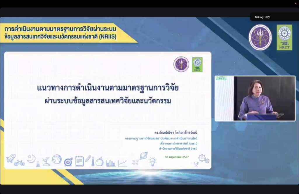เมื่อวันที่ 30 พฤษภาคม 2567 สำนักงานการวิจัยแห่งชาติ (วช.) กระทรวงการอุดมศึกษา วิทยาศาสตร์ วิจัยและนวัตกรรม (อว.) จัดงานแถลงข่าวการดำเนินงานตามมาตรฐานการวิจัยผ่านระบบข้อมูลสารสนเทศวิจัยและนวัตกรรมแห่งชาติ (NRIIS) โดย ดร.วิภารัตน์ ดีอ่อง ผู้อำนวยการสำนักงานการวิจัยแห่งชาติ (ผอ.วช.) เป็นประธานในพิธีกล่าวเปิดงานแถลงข่าว และความสำคัญของมาตรฐานการวิจัย นายสมปรารถนา สุขทวี รองผู้อำนวยการสำนักงานการวิจัยแห่งชาติ กล่าวถึงความสำคัญของมาตรฐานการวิจัย และ ดร.อัณณ์ณิชา โตกิจกล้าธวัฒน์ ผู้อำนวยการกองมาตรฐานการวิจัยและสถาบันพัฒนาการดำเนินการต่อสัตว์เพื่องานทางวิทยาศาสตร์ กล่าวถึงแนวทางการดำเนินงานตามมาตรฐานการวิจัยผ่านระบบข้อมูลสารสนเทศวิจัยและนวัตกรรมแห่งชาติ (NRIIS) ณ อาคาร วช. 8 ชั้น 1 สำนักงานการวิจัยแห่งชาติ