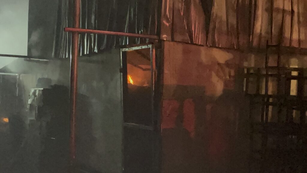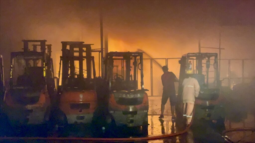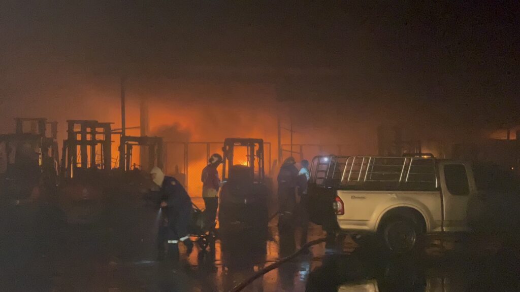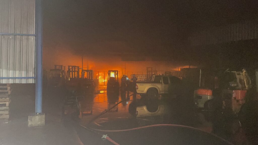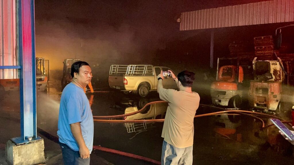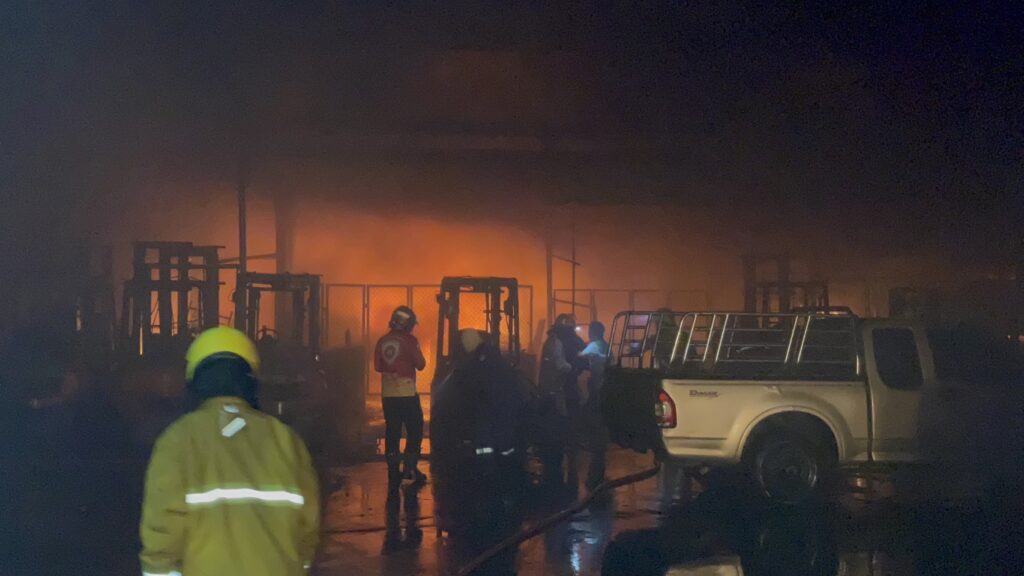 กระป๋องและอาหารทะเลบรรจุกระป๋อง ในพื้นที่ ม.3 ถ.กิจมณี ต.บางหญ้าแพรก อ.เมือง จ.สมุทรสาคร โดยจุดที่เกิดเพลิงไหม้เป็นบริเวณภายในอาคารเก็บวัสดุประเภทเศษกล่องกระดาษ วัสดุเหลือใช้ และถังเก็บนำ้มันเครื่อง