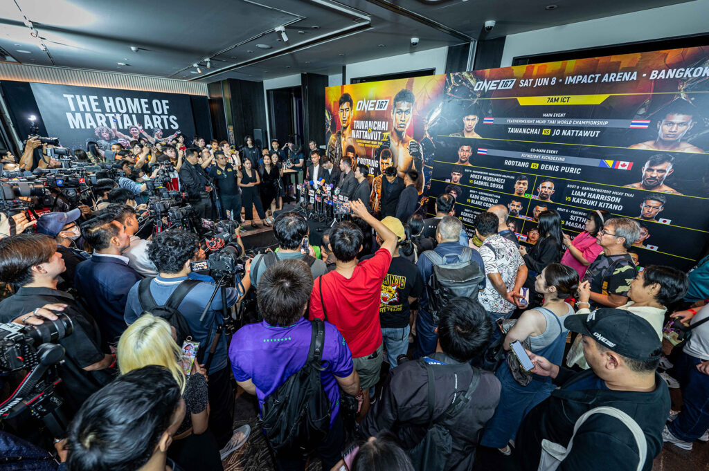 โรงแรมวอลดอร์ฟ แอสโทเรีย กรุงเทพ : วัน แชมเปียนชิพ (ONE) องค์กรศิลปะการต่อสู้ที่ยิ่งใหญ่ที่สุดในโลก แถลงข่าว-ซ้อมโชว์สื่อมวลชน ศึก ONE 167 : ตะวันฉาย vs โจ II ในวันพุธที่ 5 มิถุนายน 2567 โดยมีเหล่านักกีฬาระดับซูเปอร์สตาร์-ดาวรุ่งที่ลงทำการแข่งขัน รวมทั้งทัพสื่อมวลชนหลายร้อยสำนัก อินฟลูเอนเซอร์, แฟนคลับ เข้าร่วมงานมากมาย