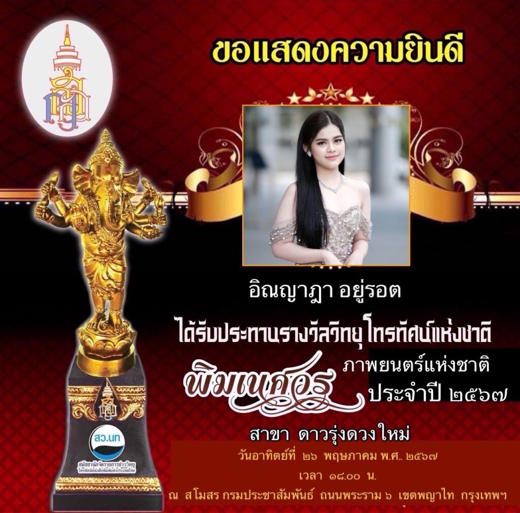 “หนูรู้สึกดีใจมากๆ ค่ะ ที่คณะกรรมการทาง สว.นท มอบรางวัลนี้ให้หนู ถือเป็นรางวัลแห่งความภาคภูมิใจมากๆ ที่ผู้ใหญ่ใจดีเห็นความสามารถในตัวหนู เห็นความตั้งใจของหนู หนูสัญญาว่าจะพัฒนาตัวเองให้ดียิ่งๆ ขึ้นไป ขอบคุณค่ะ”