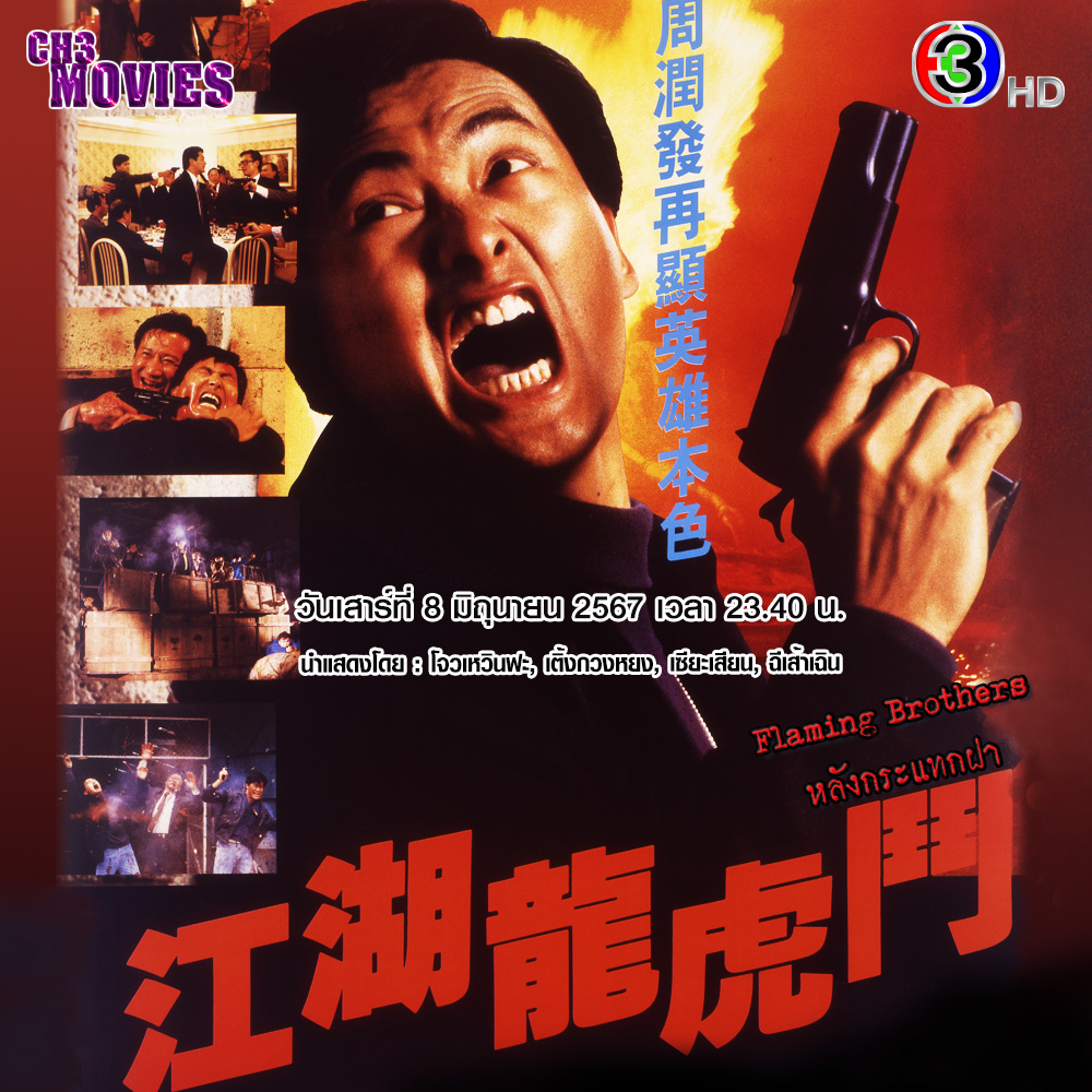 “แชนแนลทรีมูฟวี่ส์” เสนอภาพยนตร์ “หลังกระแทกฝา : Flaming Brothers” นำแสดงโดย โจวเหวินฟะ, เติ้งกวงหยง, เซียะเสียน, ฉีเส้าเฉิน เรื่องราวของ หลุน กับ เทียน เด็กกำพร้าที่เติบโตมาด้วยกัน หลุนกับเทียนสร้างตัวขึ้นมาเป็นเจ้าพ่อยิ่งใหญ่ในมาเก๊า เทียนได้พบกับ คาซี่ ซึ่งเคยให้อาหารเขากินในสมัยเด็ก ๆ เทียนตัดสินใจจะล้างมือเพื่อประกอบอาชีพสุจริต และแต่งงานกับคาซี่ หลุนเป็นห่วงความปลอดภัยของเทียน จึงจำใจตัดความสัมพันธ์กับเทียน แต่หลุนไปมีเรื่องกับ เจ้าพ่อใหญ่จนถึงขั้นตามฆ่ากัน หลุนให้เทียนไปจากฮ่องกง เพื่อกันไม่ให้เจ้าพ่อตามไปเล่นงานเทียนได้ แต่เทียนก็ตัดสินใจที่จะกลับไปช่วยหลุนที่มาเก๊า สองพี่น้องจับมือกันเล่นงานเจ้าพ่อเพราะไม่มีทางเลือก เขาทั้งสองจึงต้องเสียสละชีวิตเพื่อที่จะไปแก้แค้นเจ้าพ่อ ติดตามได้ใน “แชนแนลทรีมูฟวี่ส์” “หลังกระแทกฝา : Flaming Brothers” เวลา 23.40 น.