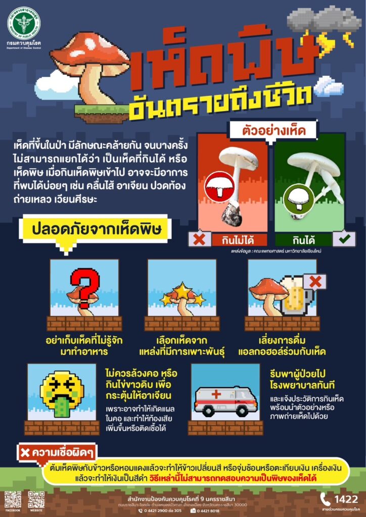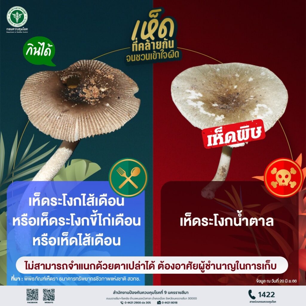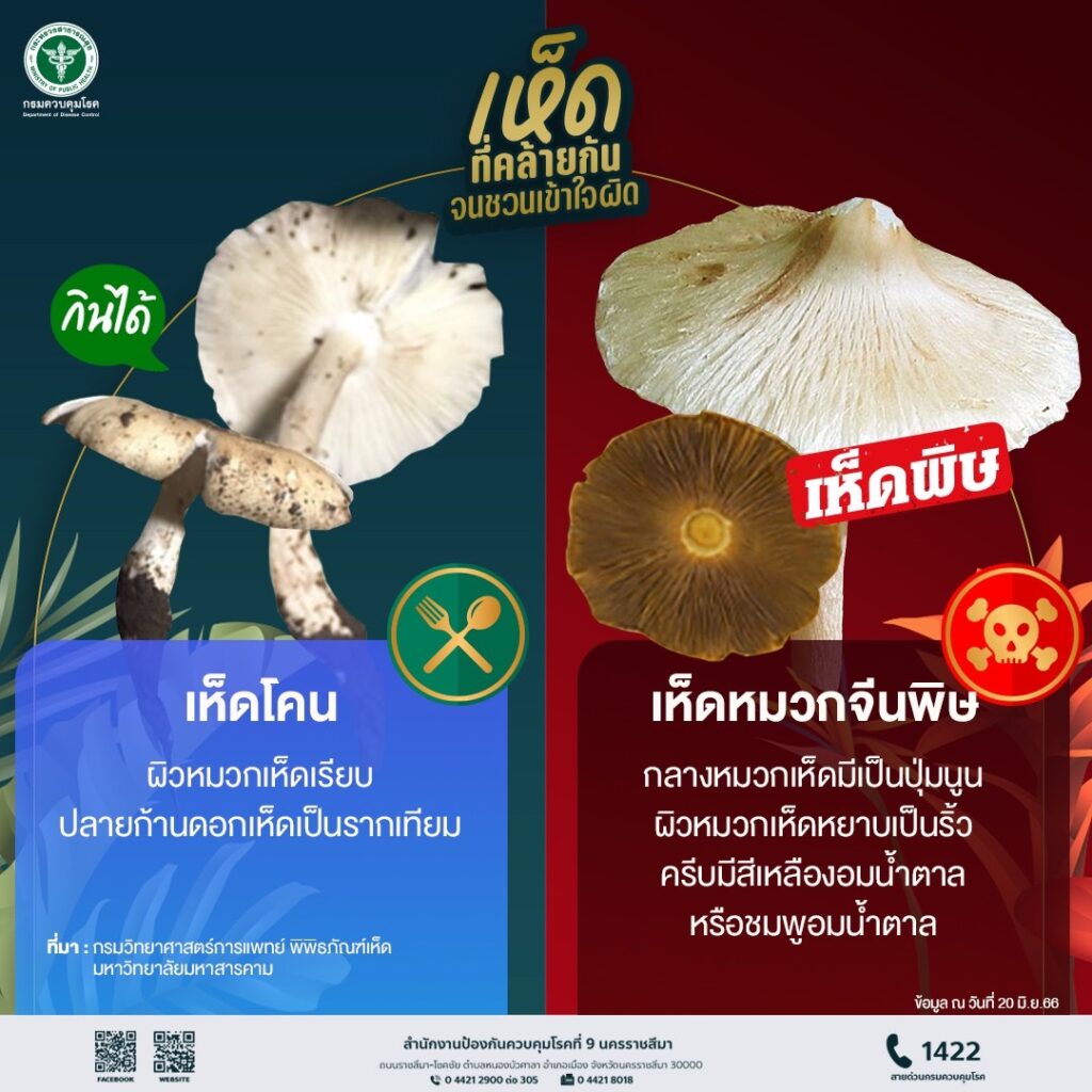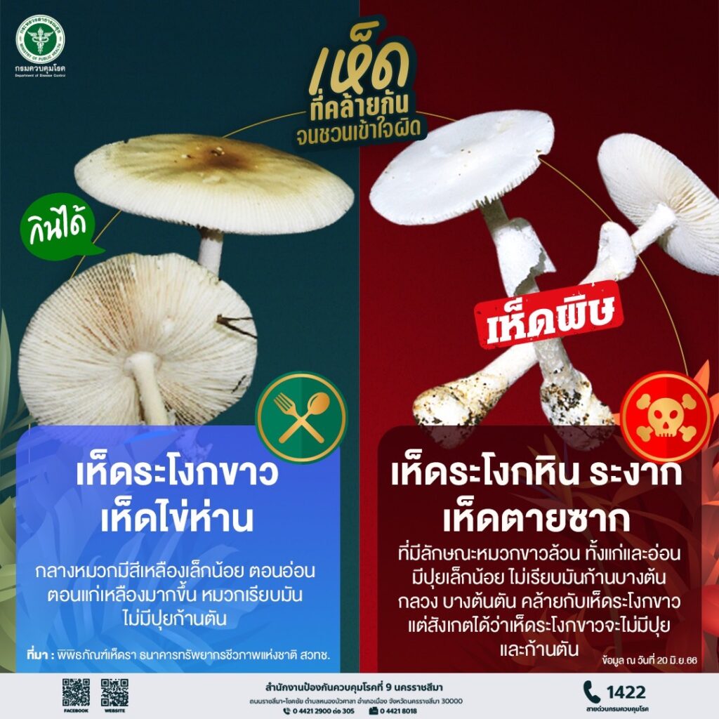 นายแพทย์ทวีชัย วิษณุโยธิน ผู้อำนวยการสำนักงานป้องกันควบคุมโรคที่ 9 นครราชสีมา กล่าวว่า ช่วงนี้มีฝนตกลงมาหลายพื้นที่ ทำให้เห็ดหลายชนิดเจริญเติบโตได้ดี โดยเฉพาะเห็ดป่าในพื้นที่ธรรมชาติ ซึ่งมีทั้งเห็ดกินได้ และเห็ดพิษ เมื่อเห็ดอยู่ในระยะดอกตูม จะมีความคล้ายคลึงกันมาก อาจทำให้ประชาชนเข้าใจผิด และนำเห็ดพิษมาปรุงประกอบอาหารได้ สำหรับเห็ดพิษที่เป็นสาเหตุทำให้เสียชีวิตส่วนใหญ่ เช่น 1) เห็ดระโงกพิษ หรือบางที่เรียกว่าเห็ดระโงกหิน เห็ดระงาก เห็ดไข่ตายซาก ซึ่งเห็ดชนิดนี้คล้ายคลึงกับเห็ดระโงกขาว ที่กินได้ แต่มีลักษณะต่างกัน คือ เห็ดระโงกพิษ รอบขอบหมวกไม่มีรอยขีด ผิวก้านเรียบหรือมีขนเล็กน้อย ถุงหุ้มโคนรูปถ้วยแนบติดกับโคนก้าน เมื่อผ่าก้านดูจะมีลักษณะตัน 2) เห็ดถ่านเลือด มีลักษณะคล้ายกับเห็ดถ่านเล็กที่กินได้ ขนาดดอกจะเล็กกว่า และไม่มีน้ำยางสีแดงส้ม 3) เห็ดเมือกไครเหลือง ที่ประชาชนมักสับสนกับเห็ดขิง ซึ่งชนิดที่เป็นพิษจะมีเมือกปกคลุมและมีสีดอกเข้มกว่า 4) เห็ดหมวกจีน มีความคล้ายกับเห็ดโคนที่กินได้ เป็นต้น สำหรับวิธีทดสอบความเป็นพิษของเห็ดโดยภูมิปัญญาชาวบ้าน เช่น ต้มเห็ดพิษกับข้าวหรือหอมแดงแล้วจะทำให้ข้าวเปลี่ยนสี หรือจุ่มช้อนหรือตะเกียบเงินเครื่องเงินแล้วจะทำให้เงินเป็นสีดำนั้น ไม่เป็นความจริง โดยเฉพาะเห็ดระโงกพิษที่มีสารที่ทนต่อความร้อน แม้จะนำมาทำให้สุกแล้วก็ไม่สามารถทำลายพิษได้