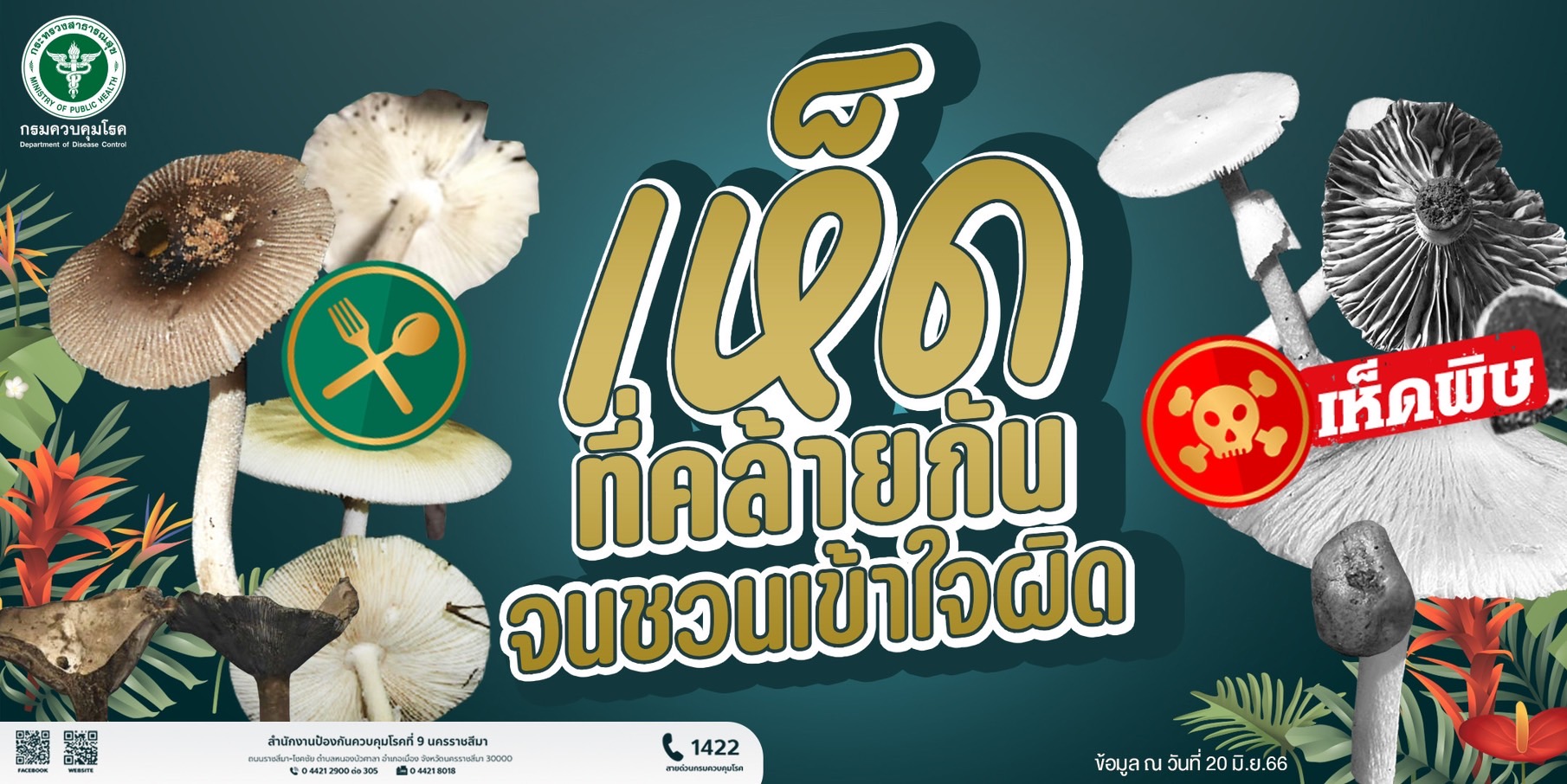 ช่วงนี้เข้าสู่ฤดูฝน ทำให้เห็ดหลายชนิดเจริญเติบโตได้ดี โดยเฉพาะเห็ดป่าตามธรรมชาติ มีทั้งเห็ดที่รับประทานได้และเห็ดพิษ ซึ่งมีลักษณะใกล้เคียงกันมาก อาจทำให้ประชาชนเข้าใจผิดแล้วนำมาปรุงอาหาร จนเกิดอาการคลื่นไส้ อาเจียน ปวดท้อง ถ่ายเหลว และเวียนศีรษะได้ สคร.9 นครราชสีมาเตือนประชาชน หากไม่แน่ใจหรือสงสัยว่าเป็นเห็ดพิษหรือไม่ ไม่ควรนำมาปรุงอาหาร ควรเลือกเห็ดจากแหล่งที่มีการเพาะพันธุ์เพื่อความปลอดภัย และหลีกเลี่ยงดื่มแอลกอฮอล์ร่วมกับการกินเห็ด