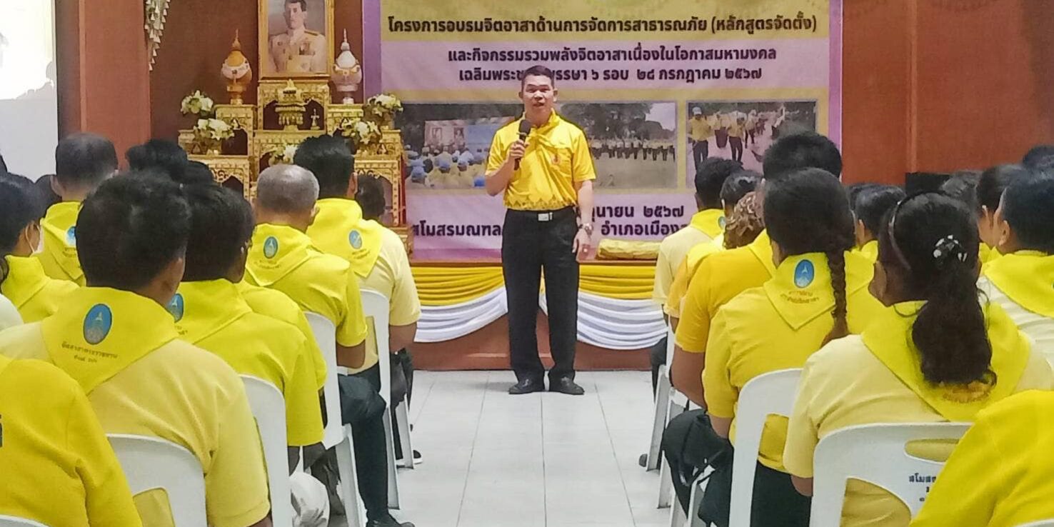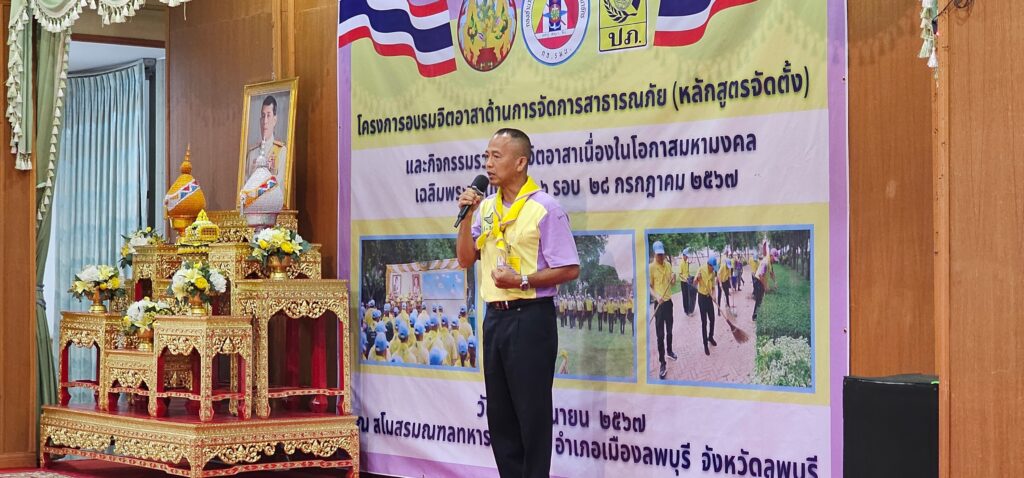 สำหรับโครงการอบรมจิตอาสาด้านการป้องกันและบรรเทาสาธารณภัยระดับอำเภอ (หลักสูตรจัดตั้ง) ประจำปี 2567 มีแผนการฝึกอำเภอครบทั้ง 11 อำเภอ เป้าหมายผู้เข้ารับการอบรมจำนวน 550 คน ซึ่งครั้งนี้ เป็นรุ่นที่ 7 ผู้เข้าร่วมอบรบจากอำเภอเมืองลพบุรี โดยมีวิทยากรจากกองอำนวยการรักษาความมั่นคงภายในจังหวัดลพบุรี สภากาชาดไทย สำนักงานสาธารณสุขจังหวัดลพบุรี สำนักงานป้องกันและบรรเทาสาธารณภัยจังหวัดลพบุรีเทศบาลเมืองเขาสามยอด เทศบาลตำบลท่าศาลา เทศบาลตำบลกกโก และเทศบาลตำบลป่าตาล มาถ่ายทอดรู้และประสบการณ์ให้กับผู้เข้ารับการอบรมในครั้งนี้