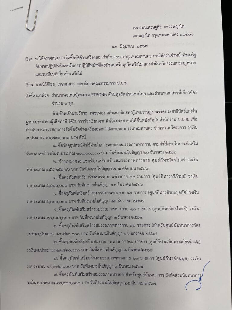 10 มิถุนายน 2567 นายวัชระ เพชรทอง อดีต ส.ส.พรรคประชาธิปัตย์ ยื่นหนังสือถึงนายนิวัติไชย เกษมมงคล เลขาธิการคณะกรรมการ ป.ป.ช. และประธาน/กรรมการปปชทุกคนผ่านงานสารบรรณปปช. ในหนังสือร้องเรียนระบุว่าได้รับการร้องเรียนจากพี่น้องประชาชนให้ยื่นหนังสือกับสำนักงาน ป.ป.ช. เพื่อดำเนินการตรวจสอบการจัดซื้อจัดจ้างเครื่องออกกำลังกายของกรุงเทพมหานคร จำนวน ๙ โครงการ วงเงินงบประมาณ ๗๗,๗๓๐,๐๐๐ บาท ดังนี้