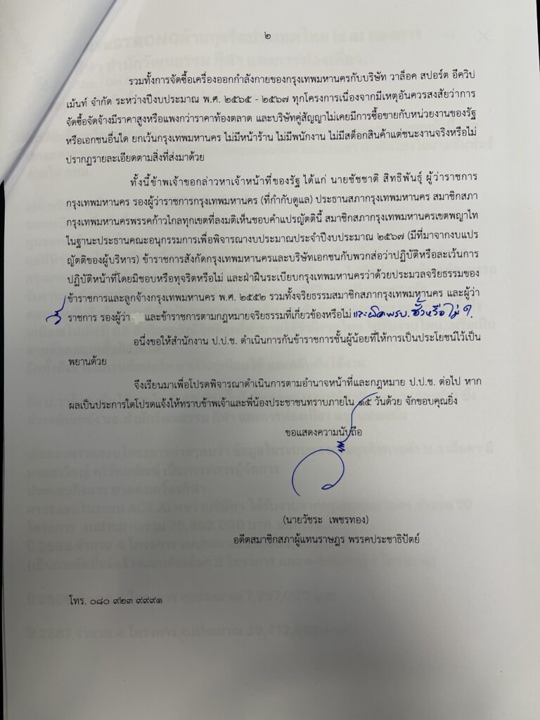 รวมทั้งการจัดซื้อเครื่องออกกำลังกายของกรุงเทพมหานครกับบริษัท วาล็อค สปอร์ต อีควิปเม้นท์ จำกัด ระหว่างปีงบประมาณ พ.ศ. ๒๕๖๕ – ๒๕๖๗ ทุกโครงการเนื่องจากมีเหตุอันควรสงสัยว่าการจัดซื้อจัดจ้างมีราคาสูงหรือแพงกว่าราคาท้องตลาด และบริษัทคู่สัญญาไม่เคยมีการซื้อขายกับหน่วยงานของรัฐหรือเอกชนอื่นใด ยกเว้นกรุงเทพมหานคร ไม่มีหน้าร้าน ไม่มีพนักงาน ไม่มีสต็อกสินค้าแต่ชนะงานจริงหรือไม่