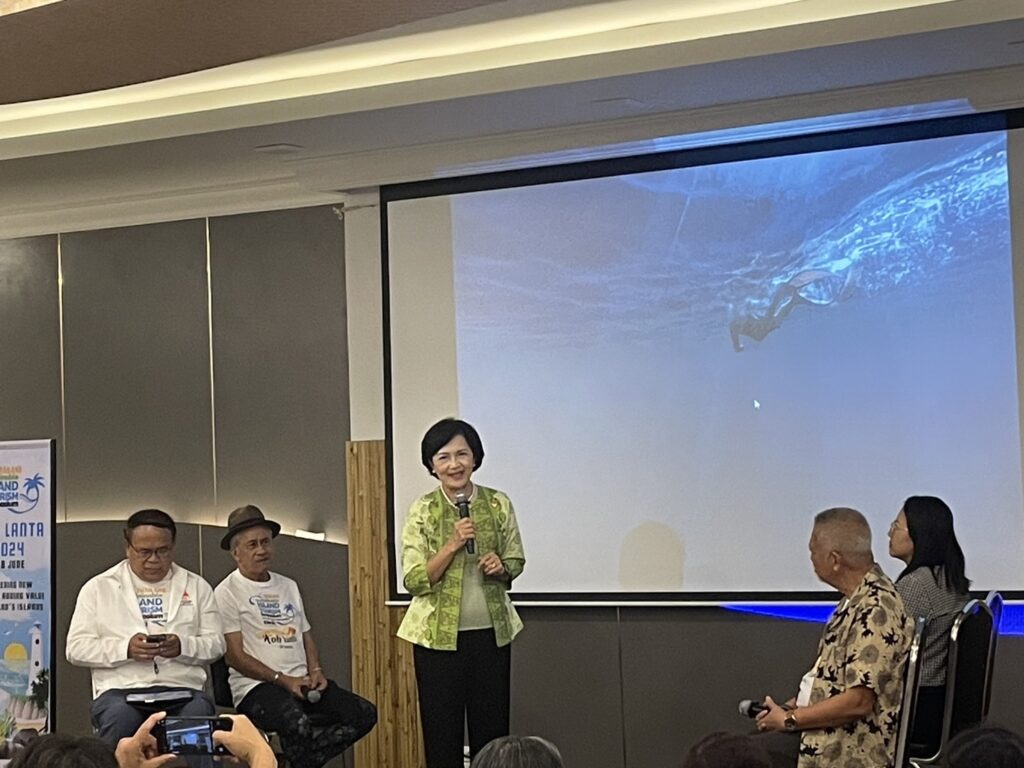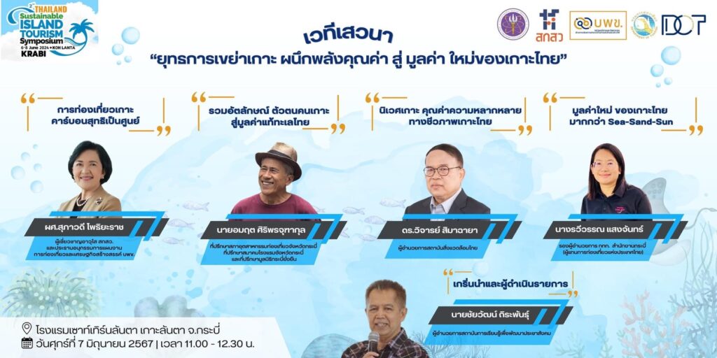 ผู้ช่วยศาสตราจารย์สุภาวดี โพธิยะราช ผู้เชี่ยวชาญอาวุโส (สกสว.) และประธานอนุกรรมการแผนงานการท่องเที่ยวและเศรษฐกิจสร้างสรรค์ (บพข.) พร้อมคณะนักวิจัยร่วมสนับสนุนการประชุมสัมมนาการท่องเที่ยวเกาะอย่างยั่งยืนประเทศไทย ครั้งที่ 2 ณ หาดคลองดาว อำเภอลันตา จังหวัดกระบี่ ระหว่างวันที่ 6-8 มิถุนายน 2567 ภายใต้แนวคิด “ผนึกพลังคุณค่า สร้างมูลค่าใหม่ของเกาะไทย” เนื่องในวันมหาสมุทรโลก ด้วยความร่วมมือของประชาคมชาวเกาะ จำนวน 33 เกาะ ร่วมกับองค์กรภาคีเครือข่าย จำนวน 31 องค์กร โดย ผู้ช่วยศาสตราจารย์สุภาวดี โพธิยะราช ร่วมเวทีเสวนา “ยุทธการเขย่าเกาะ ผนึกพลังคุณค่า สู่มูลค่าใหม่ของเกาะไทย” และนำเสนอเรื่อง การท่องเที่ยวเกาะคาร์บอนสุทธิเป็นศูนย์ ซึ่งดำเนินงานร่วมกับเครือข่ายทั้งในประเทศและต่างประเทศ และพัฒนาเส้นทางการท่องเที่ยวคาร์บอนสุทธิเป็นศูนย์ (CNT Routes) 183 เส้นทาง ที่สามารถขายได้ในตลาดต่างประเทศ โดยมีรูปแบบการรับรองตนเอง/มีส่วนร่วมกับคู่ค้าที่ได้รับการยอมรับในระดับสากล และจัดทำ Zero Carbon Application (PCR บริการท่องเที่ยว) ซึ่งมีผู้ใช้งานมากว่า 400 รายต่อเดือน ชดเชยคาร์บอนเฉลี่ยเดือนละ 31.5 tCO2eq (ข้อมูล พ.ย.66-พ.ค.67) สนับสนุนการขายคาร์บอนเครดิตขนาดเล็กสำหรับอุตสาหกรรมการท่องเที่ยว (ตลาดคาร์บอนไทย) ขับเคลื่อนพื้นที่ 23 เกาะให้เป็น CNT Destination แบ่งเป็นเกาะในฝั่งทะเลอันดามัน 9 เกาะ ได้แก่ เกาะลันตา เกาะคอเขา เกาะพระทอง เกาะยาวใหญ่ เกาะยาวน้อย เกาะปู เกาะจัม เกาะศรีบอยา เกาะลิบง และเกาะในฝั่งอ่าวไทย 14 เกาะ คือ เกาะกุลา เกาะรางบันทัด เกาะมัดหวายใหญ่ เกาะรังกาจิว เกาะกระเต็น เกาะพะลวย เกาะเต่า เกาะสมุย เกาะพะงัน เกาะช้าง เกาะกูด เกาะหมาก เกาะหวาย เกาะระยั้ง รวมทั้งการเปลี่ยนผ่านจาก Carbon Neutral Tourism – มุ่งสู่ Net Zero Tourism สำหรับผู้ร่วมเวทีเสวนาท่านอื่น ได้แก่ นายอมฤต ศิริพรจุฑากุล ที่ปรึกษาสภาอุตสาหกรรมท่องเที่ยวจังหวัดกระบี่ ที่ปรึกษาสมาคมโรงแรมจังหวัดกระบี่ และที่ปรึกษามูลนิธิกระบี่ยั่งยืน ดร.วิจารย์ สิมาฉายา ผู้อำนวยการสถาบันสิ่งแวดล้อมไทย นางรวีวรรณ แสงจันทร์ รองผู้อำนวยการ ททท. สำนักงานกระบี่ โดยมี นายชัยวัฒน์ ถิระพันธุ์ ผู้อํานวยการสถาบันการเรียนรู้เพื่อพัฒนาประชาสังคม เป็นผู้ดำเนินการเสวนาฯ
