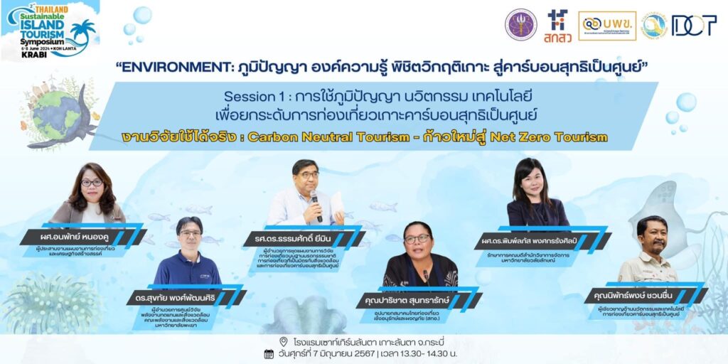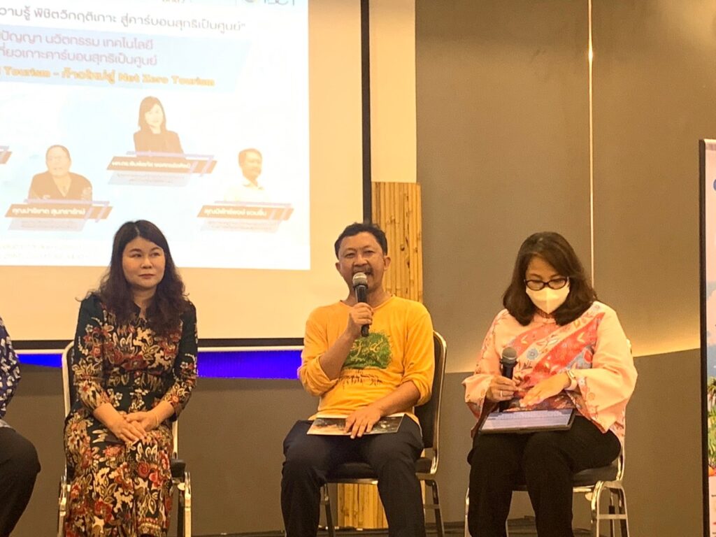 กลุ่มการท่องเที่ยวบนฐานมรดกธรรมชาติ การท่องเที่ยวที่เป็นมิตรกับสิ่งแวดล้อม และการท่องเที่ยวคาร์บอนสุทธิเป็นศูนย์ ภายใต้สำนักประสานงานการพัฒนาอุตสาหกรรมการท่องเที่ยวและเศรษฐกิจสร้างสรรค์ หน่วยงานบริหารและจัดการทุนด้านการเพิ่มความสามารถในการแข่งขันของประเทศ (บพข.) ดำเนินการเสวนา “การใช้ภูมิปัญญา นวัตกรรม เทคโนโลยีเพื่อยกระดับการท่องเที่ยวเกาะคาร์บอนสุทธิเป็นศูนย์” ภายใต้หัวข้อ “งานวิจัยใช้ได้จริง: Carbon Neutral Tourism – ก้าวใหม่สู่ Net Zero Tourism” โดยมีผู้ร่วมเสวนาประกอบด้วย รศ.ดร.ธรรมศักดิ์ ยีมิน ผู้อำนวยการแผนงานการท่องเที่ยวบนฐานมรดกธรรมชาติ การท่องเที่ยวที่เป็นมิตรกับสิ่งแวดล้อม และการท่องเที่ยวคาร์บอนสุทธิเป็นศูนย์ นายกสมาคมวิทยาศาสตร์ทางทะเลแห่งประเทศไทย และอาจารย์ประจำมหาวิทยาลัยรามคำแหง ผศ.ดร.พิมพ์ลภัส พงศกรรังศิลป์ รักษาการคณบดีสำนักวิชาการจัดการ มหาวิทยาวลัยลักษณ์ ดร.สุขทัย พงศ์พัฒนศิริ ผู้อำนวยการศูนย์วิจัยพลังงานทดแทนและสิ่งแวดล้อม คณะพลังงานและสิ่งแวดล้อม มหาวิทยาลัยพะเยา คุณปาริชาต สุนทรารักษ์ อุปนายกสมาคมไทยท่องเที่ยวเชิงอนุรักษ์และผจญภัย (TEATA) คุณนิพัทธ์พงษ์ ชวนชื่น ผู้เชี่ยวชาญด้านนวัตกรรมและเทคโนโลยีการท่องเที่ยวคาร์บอนสุทธิเป็นศูนย์ และ ผศ.อนพัทย์ หนองคู ผู้ประสานงานแผนงานการท่องเที่ยวและเศรษฐกิจสร้างสรรค์ เป็นผู้ดำเนินการเสวนาฯ โดยมีสาระสำคัญหลายประเด็น เช่น ผลการดำเนินงานวิจัยการท่องเที่ยวทางทะเลคาร์บอนสุทธิเป็นศูนย์พื้นที่ฝั่งอ่าวไทย การพัฒนามาตรฐานและหลักสูตรฝึกอบรมการท่องเที่ยวทางทะเลคาร์บอนสุทธิเป็นศูนย์ของประเทศไทย การยกระดับบริหารจัดการการท่องเที่ยวดำน้ำคาร์บอนสุทธิเป็นศูนย์ ในพื้นที่จังหวัดชุมพร สุราษฎร์ธานี และตราด การชดเชยการปล่อยคาร์บอนด้วยโครงการที่อยู่บนฐาน nature-based solution ผลการดำเนินงานวิจัยการท่องเที่ยวคาร์บอนสุทธิเป็นศูนย์พื้นที่ฝั่งทะเลอันดามัน ผลิตภัณฑ์ผ้ามัดย้อมจากผ้าปูที่นอนใช้แล้วของโรงแรมที่ผลิตโดยชุมชน การประเมินคาร์บอนฟุตปริ้นและการยกระดับการบริหารจัดการของโรงแรม การพัฒนาและยกระดับตลาดการท่องเที่ยวคาร์บอนสุทธิเป็นศูนย์ นวัตกรรมและเทคโนโลยีการท่องเที่ยวคาร์บอนสุทธิเป็นศูนย์ที่มีอยู่ในปัจจุบัน และมุ่งสู่การท่องเที่ยวปล่อยก๊าซเรือนกระจกเป็นศูนย์ (Net Zero Tourism)