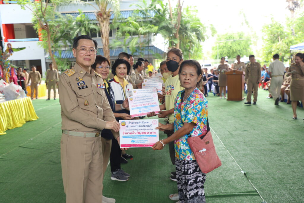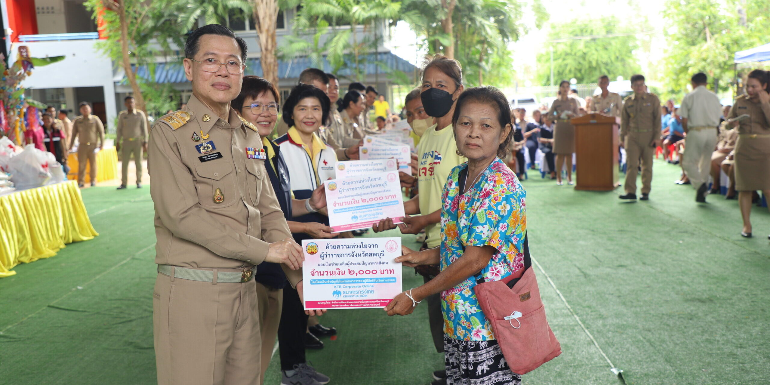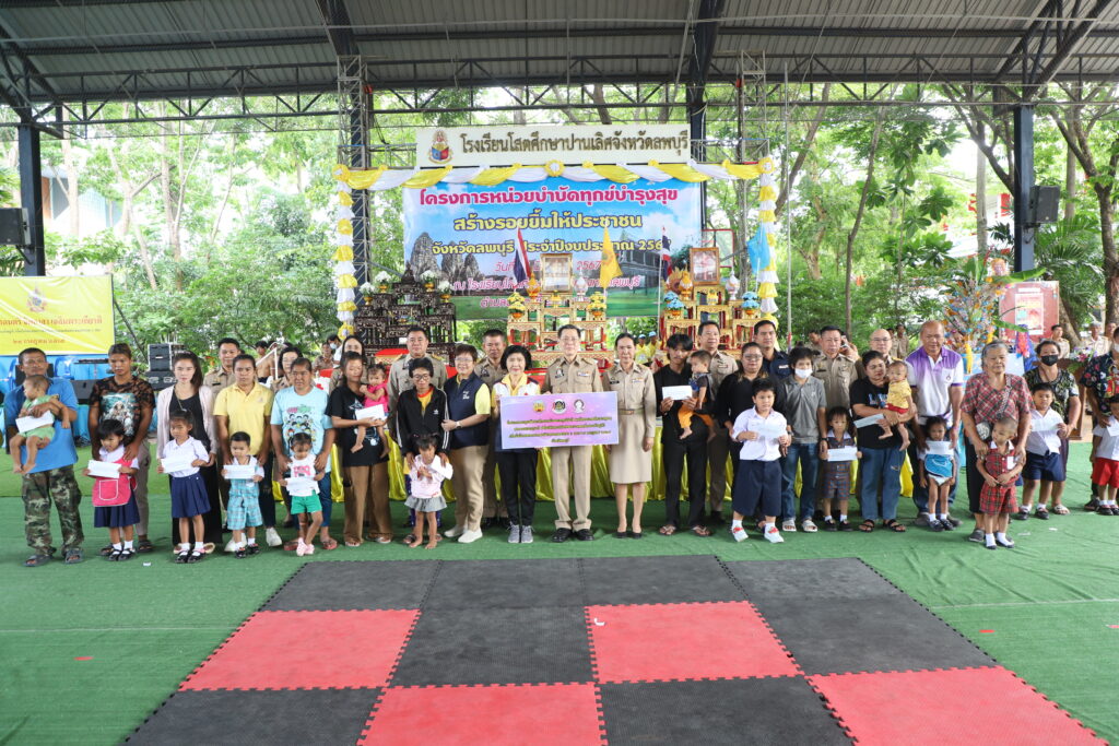 ทั้งนี้ ผู้ว่าราชการจังหวัดลพบุรี และหัวหน้าส่วนราชการ ได้ร่วมกันมอบเงินกองทุนพัฒนาเด็กชนบทในพระราชูปถัมป์สมเด็จพระเทพรัตนราชสุดาฯ สยามบรมราชกุมารีในการอุปการะเด็กชนบท การมอบเงินสงเคราะห์ (พมจ.) ถุงยังชีพแก่ผู้ประสบปัญหาทางสังคม (กาชาด) และพิธีมอบธงตราสัญลักษณ์เฉลิมพระเกียรติฯ ให้กับผู้แทนท้องถิ่น เพื่อนำไปประดับในชุมชนของตนเอง จากนั้นได้เยี่ยมชมกิจกรรมการให้บริการประชาชนของส่วนราชการต่าง ๆ ที่ให้บริการประชาชน ซึ่งโครงการบำบัดทุกข์ บำรุงสุข สร้างรอยยิ้มให้ประชาชนจังหวัดลพบุรีจะหมุนเวียนไปตามอำเภอต่าง ๆ เพื่อให้ประชาชนในพื้นที่อำเภอห่างไกลได้มีโอกาสได้รับบริการจากหน่วยงานราชการอย่างเท่าเทียมกัน