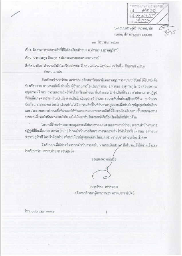 ขอความอนุเคราะห์ให้กระทรวงเกษตรและสหกรณ์ช่วยประสานสำนักงานการปฏิรูปที่ดินเพื่อเกษตรกรรม (สปก.) โปรดดำเนินการติดตามการขอกรรมสิทธิ์ที่ดินโรงเรียนท่าชนะ อ.ท่าชนะ จ.สุราษฎร์ธานี โดยเร็วที่สุดด้วย เพื่อประโยชน์สูงสุดกับนักเรียนและประชาชนชาวท่าชนะโดยเร็วที่สุด