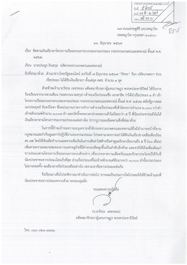 รายละเอียดในหนังสือเรื่องเรือประมง ระบุว่าด้วยได้รับการร้องเรียนจากนางดวงเดือน (ขอสงวนนามสกุล) เจ้าของเรือประมงชื่อ เอกสาธิต ว่าได้นำเรือประมง ๑ ลำ เข้าโครงการเรือออกนอกระบบของกรมประมง กระทรวงเกษตรและสหกรณ์ ตั้งแต่ พ.ศ. ๒๕๖๒ สมัยรัฐบาลพลเอกประยุทธ์ จันทร์โอชา ซึ่งหน่วยงานราชการทำการสำรวจเรือประมงที่เข้าโครงการจำนวน ๒,๐๐๐ กว่าลำ เข้าหลักเกณฑ์จำนวน ๑,๐๐๗ ลำ และบัดนี้ระยะเวลาล่วงเลยมาแล้วไม่น้อยกว่า ๕ ปี พี่น้องประชาชนยังไม่ได้เงินเยียวยาตามโครงการของกรมประมงแต่อย่างใด ขอความอนุเคราะห์ให้กระทรวงเกษตรและสหกรณ์ซึ่งมีอำนาจหน้าที่ตามกฎหมายและกำกับดูแลการปฏิบัติงานของกรมประมง โปรดหามาตรการอย่าได้หักเงินเยียวยาเหลือเพียงร้อยละ ๗๕ โดยให้เงินเต็มจำนวนและควรเพิ่มเงินในการเสียค่าไฟฟ้าหรือค่าดูแลรักษาเรือนานถึง ๕ ปี (๖๐ เดือน) เพิ่มตามความเหมาะสมของภาวะเศรษฐกิจที่มีค่าครองชีพสูงขึ้นเป็นลำดับอีกด้วย และควรให้เงินเพิ่มเติมแก่ชาวประมงตามโครงการเรือออกนอกระบบดังกล่าว เพื่อบรรเทาความเดือดร้อนและรักษาประโยชน์ให้กับพี่น้องประชาชนชาวประมงโดยเร็วที่สุด ส่วนเรือประมงที่ไม่เข้าหลักเกณฑ์อีกมากกว่า ๑,๐๐๐ ลำนั้นกรมประมงไม่อาจทอดทิ้ง จะเยียวยาหรือช่วยเหลืออย่างไร เพราะเขาคือชาวประมงเช่นกัน