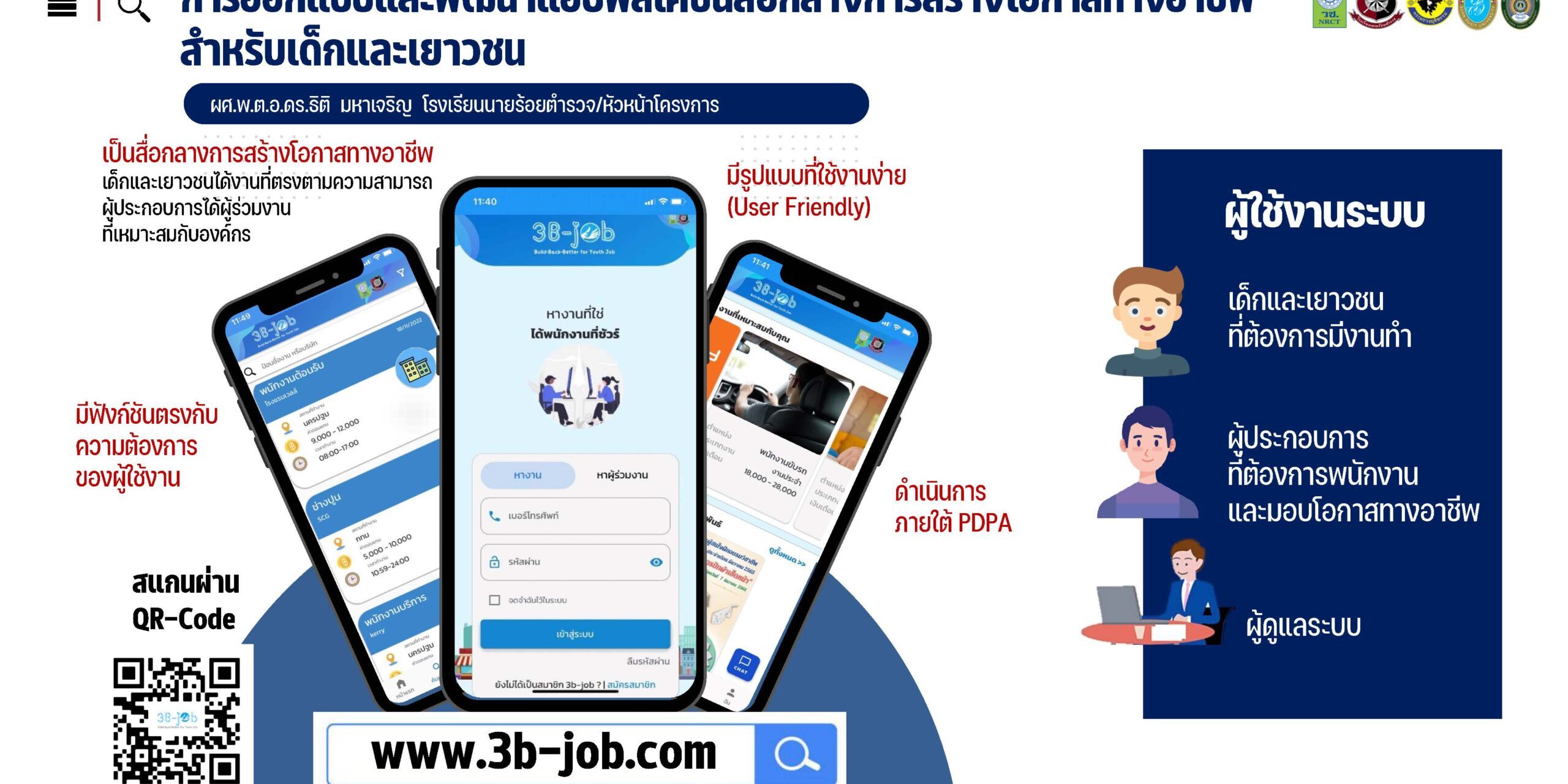ผศ.พ.ต.อ.ดร.ธิติ มหาเจริญ รองคณบดีคณะนิติวิทยาศาสตร์ โรงเรียนนายร้อยตำรวจ กล่าวว่า โครงการออกแบบพัฒนาแอปพลิเคชัน “3B-JOB” เป็นโครงการวิจัยที่ได้รับการสนับสนุนจาก (วช.) ซึ่งมุ่งเน้นการสร้างโอกาสทางอาชีพสำหรับเด็กและเยาวชนที่เคยก้าวพลาด ด้วยการใช้แอปพลิเคชันเป็นสื่อกลางระหว่างผู้ประกอบการ นายจ้าง และเด็ก เยาวชนที่ต้องการมีงานทำ โดยแบ่งผู้ใช้งานออกเป็น 2 กลุ่ม ได้แก่ 1) กลุ่มเครือข่ายส่งเสริมอาชีพ คือ กลุ่มผู้ประกอบการหรือนายจ้างที่สามารถประชาสัมพันธ์ภารกิจของหน่วยงานลงประกาศรับสมัครงาน และเสนอตำแหน่งงานที่เหมาะสมให้กับเด็กและเยาวชนได้โดยตรง และ 2) กลุ่มเด็กและเยาวชนที่ต้องการมีงานทำ ซึ่งสามารถสร้างโปรไฟล์ ลงประวัติส่วนตัว และนำเสนอศักยภาพและทักษะในด้านต่างๆ ที่ตรงตามความต้องการของตนเองและตลาดแรงงาน