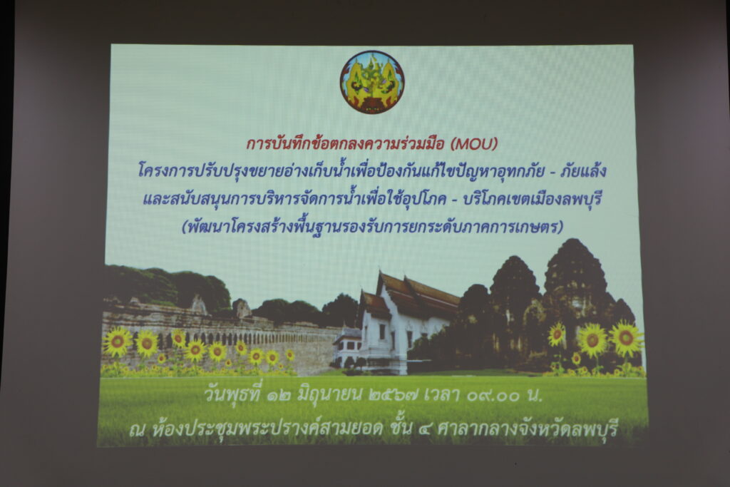 วันที่ 12 มิถุนายน 2567 เวลา 09.00 น. ที่ห้องประชุมพระปรางค์สามยอด ชั้น 4 ศาลากลางจังหวัดลพบุรี นายอำพล อังคภากรณ์กุล ผู้ว่าราชการจังหวัดลพบุรี นาวาอากาศเอก เทพพนม สุวรรณสาร ผู้บังคับการกองบิน 2 นายนรินทร์ นิ่มวิญญา ผู้อำนวยการโครงการชลประทานลพบุรี นายยุทธพงศ์ พิชญาภรณ์ ผู้จัดการการประปาส่วนภูมิภาคสาขาลพบุรี นายพรชัย พงษ์ภู่ ธนารักษ์พื้นที่จังหวัดลพบุรี นางสายใจ เลิศวิริยะประภา นายกเทศมนตรีเมืองเขาสามยอด. ทำพิธีลงนามบันทึกข้อตกลงความร่วมมือ (MOU) โครงการปรับปรุงขยายอ่างเก็บน้ำเพื่อป้องกันแก้ไขปัญหา อุทกภัย – ภัยแล้ง และสนับสนุนการบริหารจัดการน้ำเพื่อใช้อุปโภค – บริโภคเขตเมืองลพบุรี ในพื้นที่ กองบิน 2 รวมเนื้อประมาณ162ไร่เศษ งบประมาณดำเนินการรวม 43 ล้านบาท