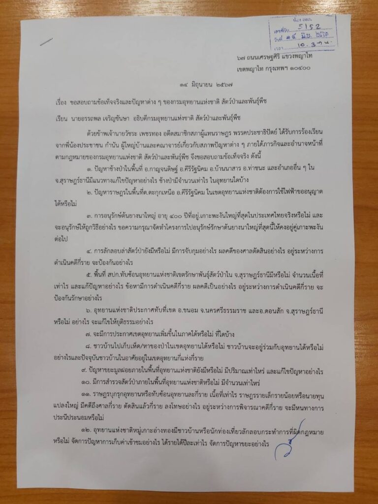 นายอรรถพล เจริญชันษา อธิบดีกรมอุทยานแห่งชาติ สัตว์ป่าและพันธุ์พืช กล่าวว่าขอขอบคุณนายวัชระ เพชรทอง ที่ได้นำปัญหาของชาวบ้านทั้ง 14 เรื่อง มาถามในวันนี้อาจตอบไม่ได้ทั้งหมดทันทีแต่จะส่งหนังสือตอบกลับในภายหลัง ปีนี้กรมอุทยานฯ มีรายได้ 1,600 ล้านบาท ที่จะใช้ดูแลพนักงานเจ้าหน้าที่และในเรื่องที่จำเป็น มีการจัดเก็บอย่างโปร่งใส ปีหน้าตั้งเป้าไว้ที่ 2,000 ล้านบาท พร้อมบริการประชาชน และเป็นข่าวดีว่าสำหรับปีงบประมาณ 2568 สำนักงบประมาณได้จัดงบประมาณให้กรมอุทยานฯ เพื่อหาที่ดินให้ชาวบ้านรายย่อยให้เสร็จภายในปี 2568