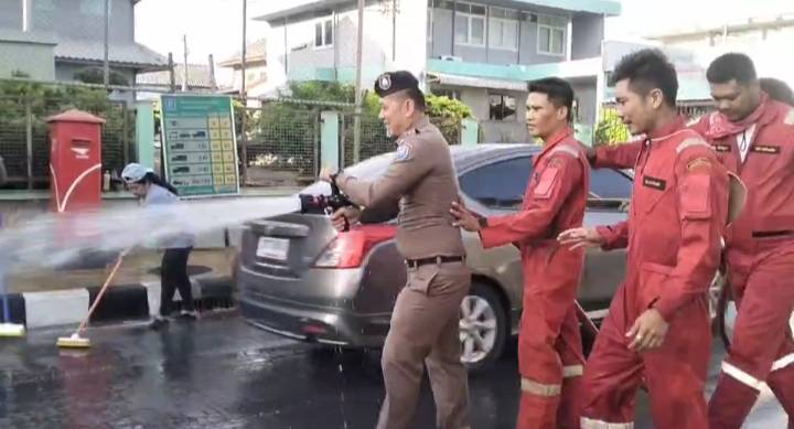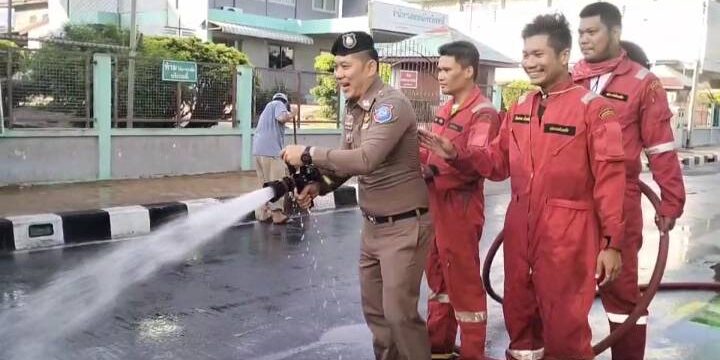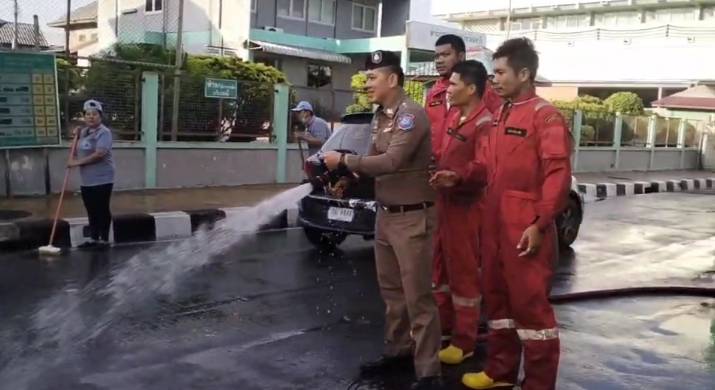 จับสายยางดับเพลิง ฉีดล้างถนนหน้า พระปรางค์สามยอด