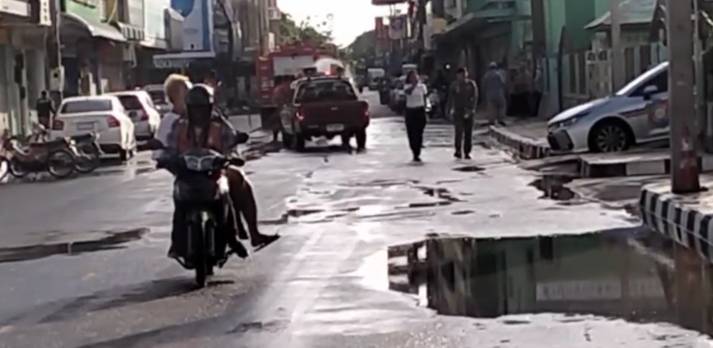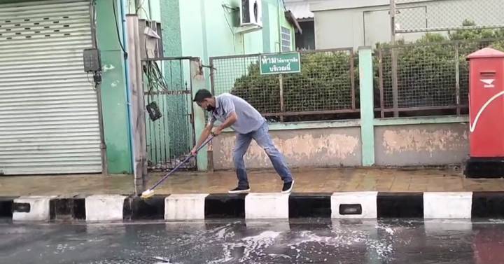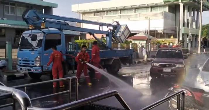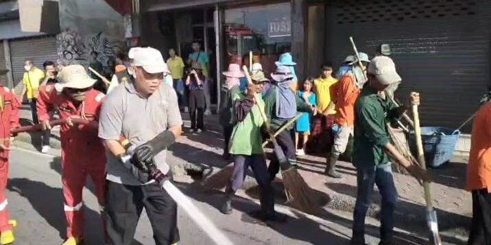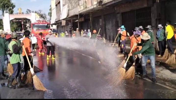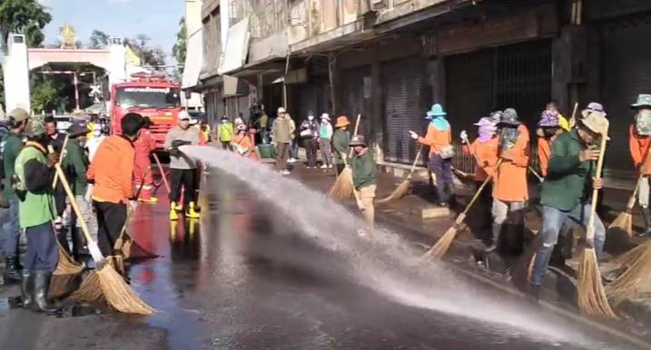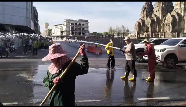 นายกเทศมนตรีเมืองลพบุรี จับสายยางดับเพลิง ฉีดล้างถนนหน้า พระปรางค์สามยอด