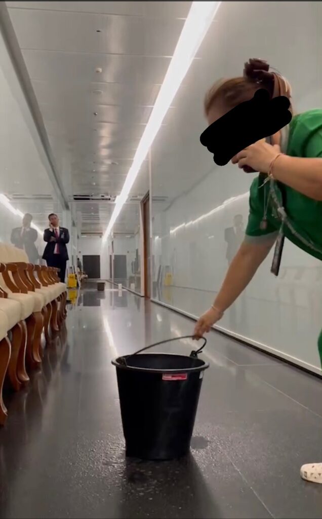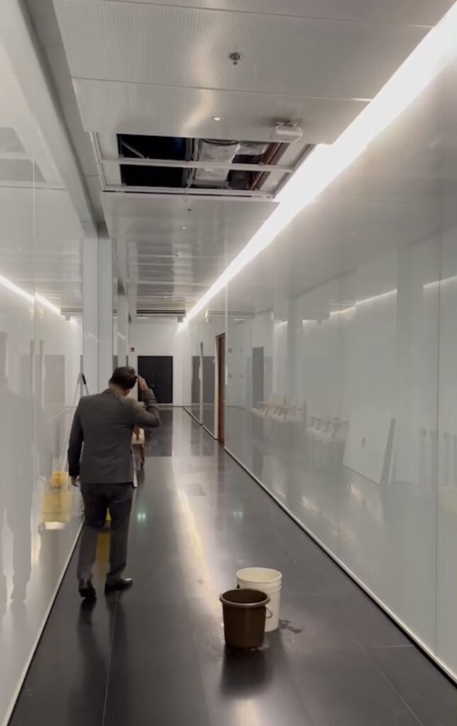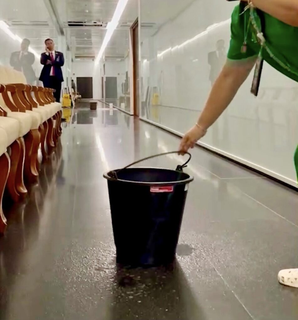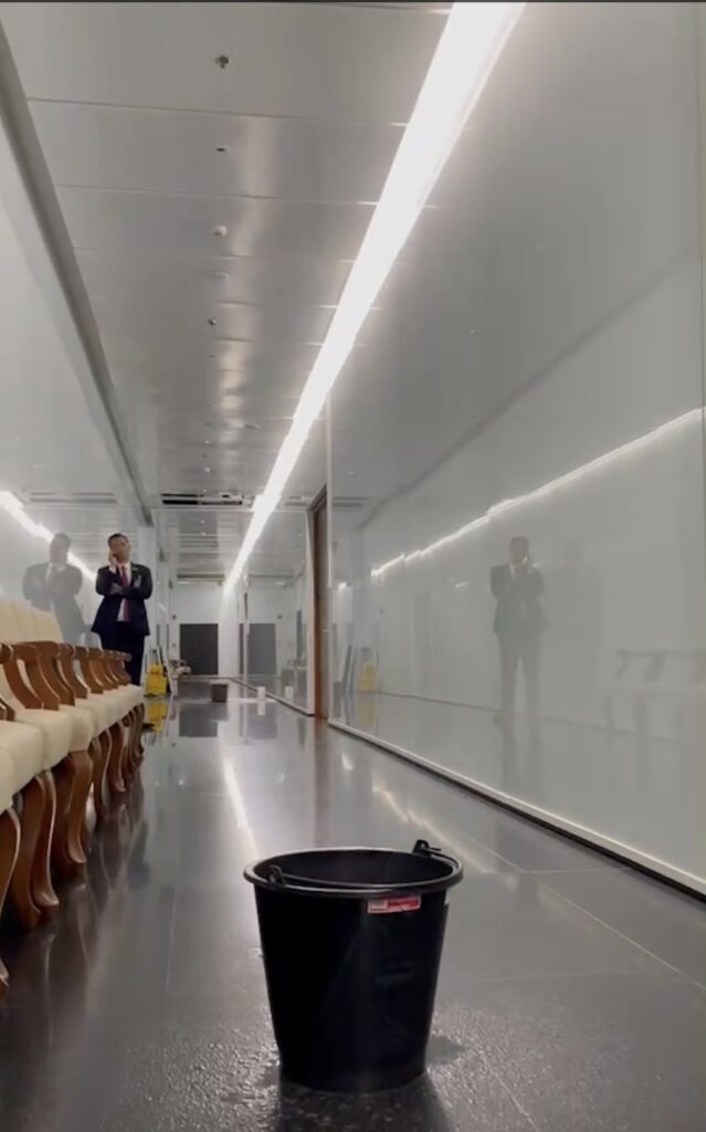 นายวัชระ เพชรทอง อดีตสส.พรรคประชาธิปัตย์ กล่าวว่า การประชุมพิจารณาร่างพระราชบัญญัติงบประมาณรายจ่ายประจำปีงบประมาณ 2568 เป็นวันแรก ปรากฏว่าช่วงเย็นมีฝนตกแรงทำให้เกิดน้ำรั่วหลายจุดหลายชั้นในอาคารรัฐสภา ข้าราชการรัฐสภาท่านหนึ่ง (ไม่ประสงค์ออกนาม) ได้ส่งคลิปบริเวณที่น้ำรั่วจากเพดานชั้น 2 หน้าห้องรับรองคณะรัฐมนตรีซึ่งเป็นจุดรั่วแห่งใหม่ที่ไม่เคยปรากฏมาก่อน พนักงานรักษาความสะอาดต้องนำถังพลาสติก 3 ถัง มา รองรับน้ำรั่วหน้าห้องรับรอง ครม. จากอาคารรัฐสภา ราคา 12,280 ล้านบาท