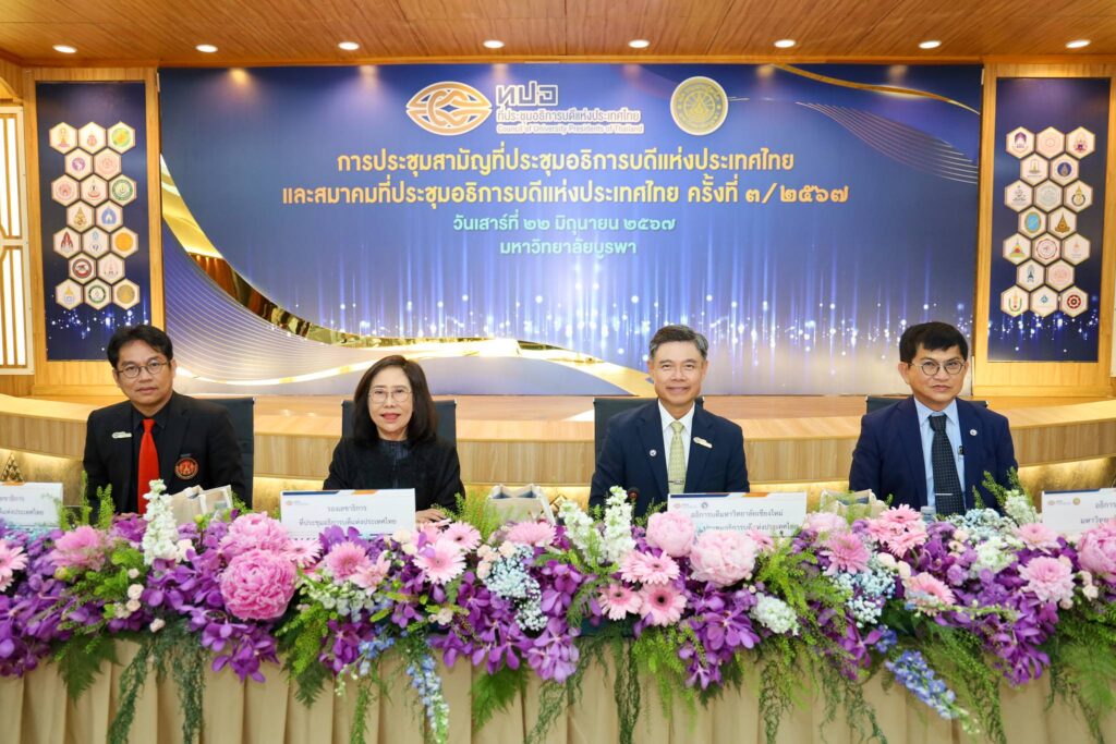 วันที่ 22 มิถุนายน พ.ศ.2567 เวลา 08.30 น. ณ ห้องประชุมเทาทอง 1 ชั้น 2 ศูนย์ปฏิบัติการโรงแรมมหาวิทยาลัยบูรพา ซึ่งในครั้งนี้มหาวิทยาลัยบูรพา ได้รับเกียรติเป็นเจ้าภาพการประชุมสามัญที่ประชุมอธิการบดีแห่งประเทศไทย (ทปอ.) และสมาคมที่ประชุมอธิการบดีแห่งประเทศไทย ครั้งที่ 3/2567 เพื่อเป็นการแลกเปลี่ยนเรียนรู้ ร่วมกันพิจารณาปัญหาในประเด็นต่างๆ รวมถึงรายงานผลการดำเนินงานของคณะกรรมการตามโครงสร้างของ (ทปอ.) อีกทั้งยังเป็นการเสริมสร้างความสัมพันธ์ระหว่างสถาบันที่เป็นสมาชิก (ทปอ.) ในโอกาสนี้ได้รับเกียรติจาก ศาสตราจารย์ ดร.นายแพทย์พงษ์รักษ์ ศรีบัณฑิตมงคล ประธานที่ประชุมอธิการบดีแห่งประเทศไทย/อธิการบดีมหาวิทยาลัยเชียงใหม่ กล่าวเปิดการประชุมฯ และดำเนินการประชุมตามวาระการประชุมฯ โดยมี รองศาสตราจารย์ ดร.วัชรินทร์ กาสลัก ผู้รักษาการแทนอธิการบดีมหาวิทยาลัยบูรพา กล่าวต้อนรับผู้ที่เข้าร่วมประชุมฯ พร้อมทั้งแนะนำคณะผู้บริหารของมหาวิทยาลัยบูรพา