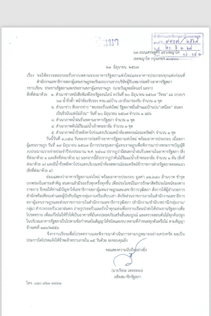 ย่อมแสดงว่าอาคารรัฐสภาแห่งใหม่ พร้อมอาคารประกอบ มูลค่า ๑๒,๒๘๐ ล้านบาท ชำรุดบกพร่องในสาระสำคัญ ฝนตกแล้วมีรอยรั่วทุกครั้งทุกชั้น เพื่อประโยชน์ในการรักษาสิทธิประโยชน์ของทางราชการ จึงขอให้ท่านมีบัญชาให้เลขาธิการสภาผู้แทนราษฎรและเลขาธิการวุฒิสภา สั่งการให้ผู้อำนวยการสำนักหรือเทียบเท่าและผู้บังคับบัญชากลุ่มงานหรือเทียบเท่า สังกัดส่วนราชการภายในสำนักงานเลขาธิการสภาผู้แทนราษฎรและส่วนราชการภายในสำนักงานเลขาธิการวุฒิสภา (สำนักงาน/สำนัก/สถานี/กลุ่มงาน/กลุ่ม) สำรวจรอยรั่วเวลาฝนตก ถ่ายรูปรอยรั่วและถังน้ำทุกแห่งเพื่อกราบเรียนนำส่งให้ประธานรัฐสภาเพื่อโปรดทราบ เพื่อแก้ไขไม่ให้รั่วให้เป็นอาคารที่มั่นคงปลอดภัยเสร็จสิ้นสมบูรณ์ และตรวจสอบต้นไม้ทุกต้นปลูกในบริเวณอาคารรัฐสภาเป็นไปตามข้อกำหนดในสัญญาได้ชนิดและขนาดตามที่กำหนดทุกต้นหรือไม่ ตามสัญญาจ้างเลขที่ ๑๑๖/๒๕๕๖