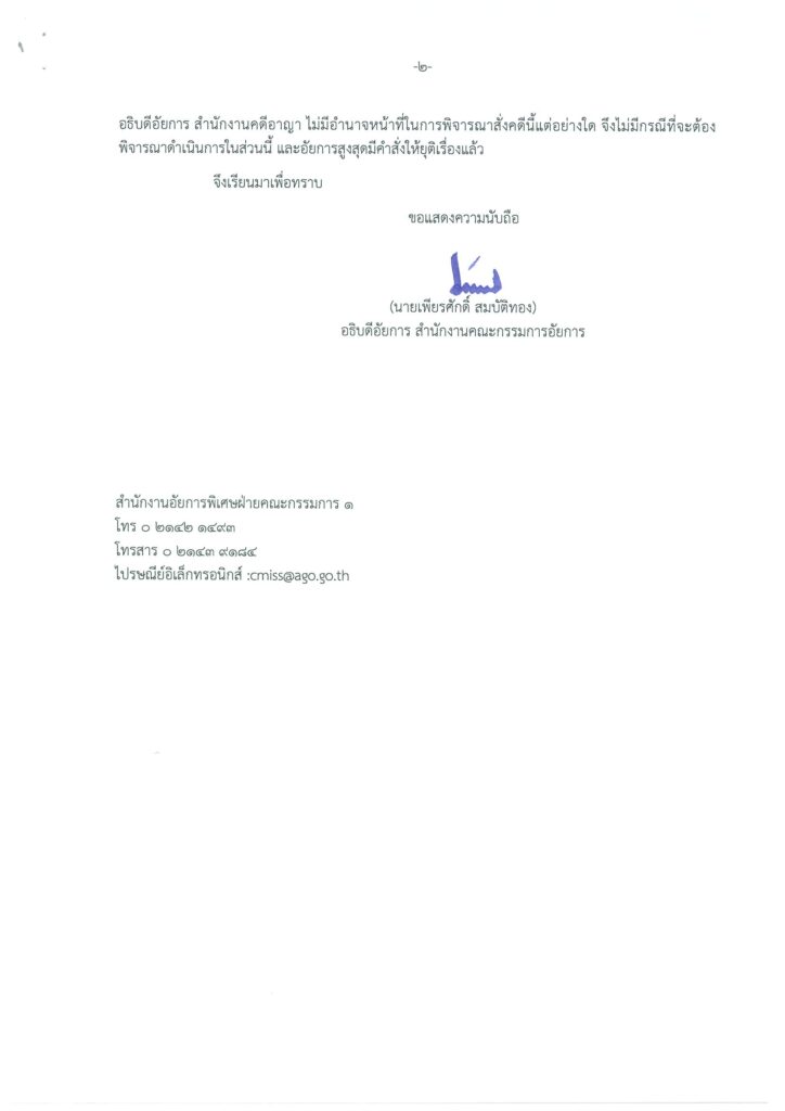 ส่วนกรณีขอให้นายปรีชา สุดสงวน พ้นจากหน้าที่ในการดูแลคดีนั้นเนื่องจากคดีนี้เป็นความผิดตามกฎหมายไทยได้กระทำลงนอกราชอาณาจักรไทย ซึ่งอยู่ในอำนาจหน้าที่พิจารณาสั่งคดีของอัยการสูงสุดตามประมวลกฎหมายวิธีพิจารณาความอาญา มาตรา 20 ประกอบระเบียบสำนักงานอัยการสูงสุดว่าด้วยการดำเนินการการดำเนินคดีอาญาของพนักงานอัยการ พ.ศ. 2563 ข้อ 208 นายปรีชา สุดสงวน ในฐานะอธิบดีอัยการ สำนักงานคดีอาญา ไม่มีอำนาจหน้าที่ในการพิจารณาสั่งคดีนี้แต่อย่างใด จึงไม่มีกรณีที่จะต้องพิจารณาดำเนินการในส่วนนี้และอัยการสูงสุดมีคำสั่งให้ยุติเรื่องแล้ว ลงชื่อ นายเพียรศักดิ์ สมบัติทอง อธิบดีอัยการ สำนักงานคณะกรรมการอัยการ