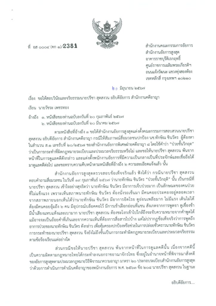 ตามที่ขอให้สำนักงานอัยการสูงสุดแต่งตั้งคณะกรรมการสอบสวนนายปรีชา สุดสงวน อธิบดีอัยการ สำนักงานคดีอาญา กรณีให้สัมภาษณ์สื่อมวลชนปกป้อง นช.ทักษิณ ชินวัตร ผู้ต้องหาในสำนวน ส.1 เลขรับที่ 20/2567 ของสำนักงานอัยการพิเศษฝ่ายคดีอาญา 8 โดยใช้คำว่า “ป่วยขั้นวิกฤต” ว่าเป็นการกระทำที่ผิดกฎหมายระเบียบและประมวลจริยธรรมหรือไม่ และขอให้นายปรีชา สุดสงวน พ้นจากหน้าที่ในการดูแลคดีดังกล่าว และแต่งตั้งพนักงานอัยการที่มีความเป็นกลางเป็นที่ประจักษ์และเชื่อถือได้มาดูแลคดีต่อไป และขอทราบความคืบหน้านั้น