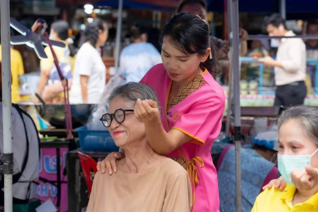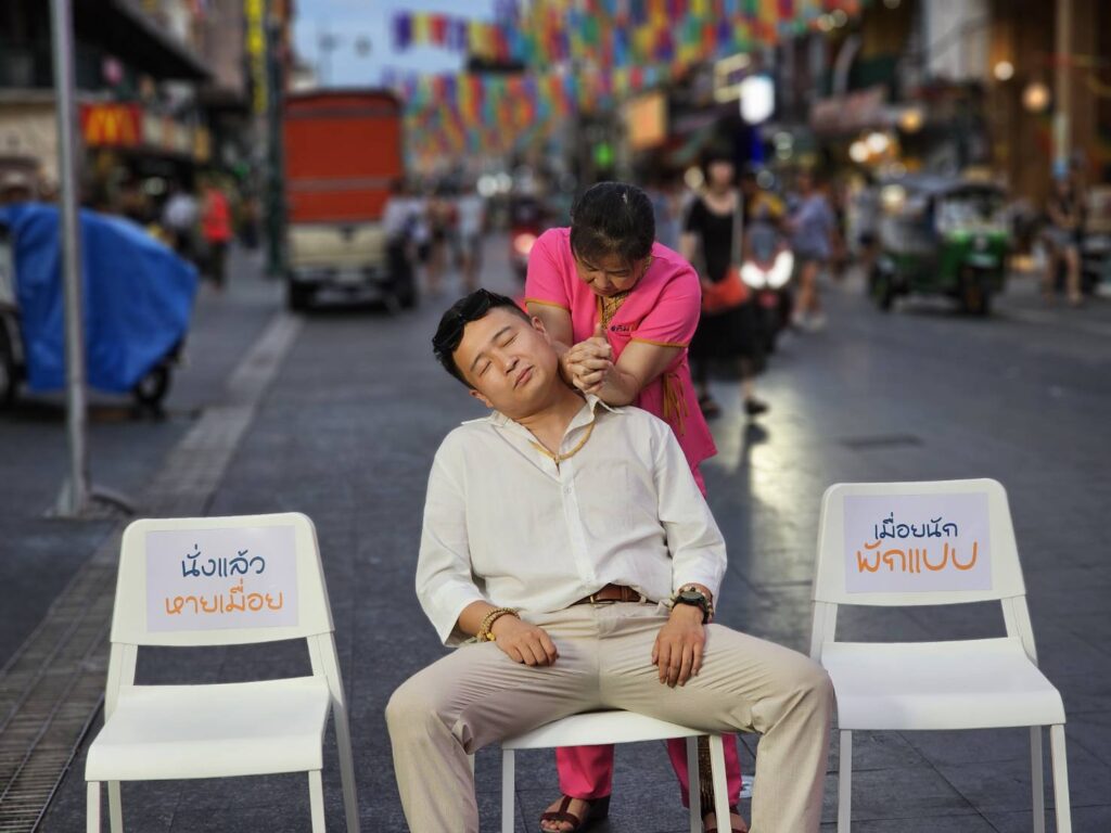 ทำเอาเหล่าพ่อค้าแม่ค้าและประชาชนต้องประหลาดใจ เมื่อมีเก้าอี้ติดป้าย “นั่งแล้วหายเมื่อย” ตั้งตามจุดต่าง ๆ ในกรุงเทพมหานคร ทั้งสำนักงานเขตหลักสี่ ตลาดกระทรวงการคลัง สวนวชิรเบญจทัศ (สวนรถไฟ) และถนนข้าวสาร เพื่อบริการนวดคลายเส้นฟรีให้แก่พนักงานบริการประชาชน ผู้คนทั่วไป และชาวต่างชาติ ที่เกิดอาการปวดเมื่อยเหนื่อยล้าตามร่างกาย นำทัพด้วยหมอนวดหัตถ์เทวดา “พี่ยาใจ” โดย เนสท์-นิศาชล สิ่วไธสง และเหล่าหมอนวดแผนไทยจากสมาคมชมรมผู้ปกครองเด็กพิการ ซึ่งผู้รับเข้าบริการทุกคนต่างพูดเป็นเสียงเดียวกันว่า “รู้สึกผ่อนคลาย สบาย หายเมื่อย หายเครียดเป็นปลิดทิ้ง”