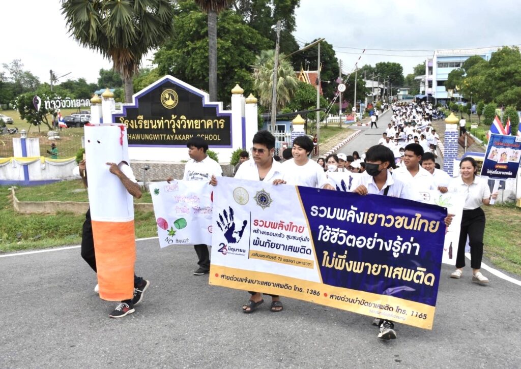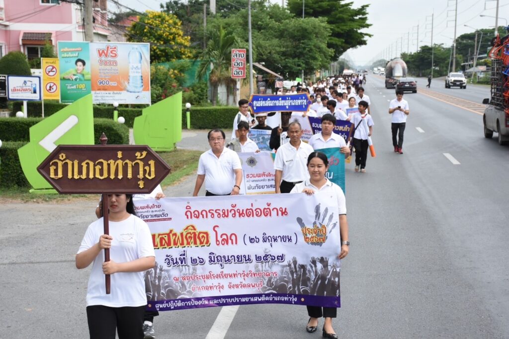 เกี่ยวกับโทษของยาเสพติด เยี่ยมชมนิทรรศการวันยาเสพติด การเผาทำลายสัญญลักษณ์ของยาเสพติดและเดินขบวนรณรงค์ประชาสัมพันธ์ ต่อต้านยาเสพติด ในเขตเทศบาลตำบลท่าวุ้ง
