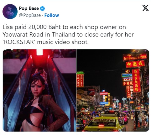 ล่าสุด ทางสื่อ POP Base มีการเปิดเผยตัวเลขจำนวนเงินที่ ลิซ่า จ่ายให้กับร้านค้าย่านเยาวราช หลังทำงานการปิดถนนเยาวราช ย่านที่ขึ้นชื่อว่าสีสันและอาหารอร่อยที่สุดเพื่อถ่ายทำ MV โดยรายงานระบุว่า ลิซ่า จ่ายเงินให้แต่ละร้ายรายละ 20,000 บาท