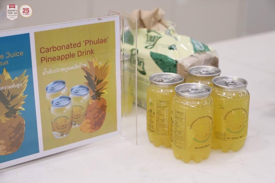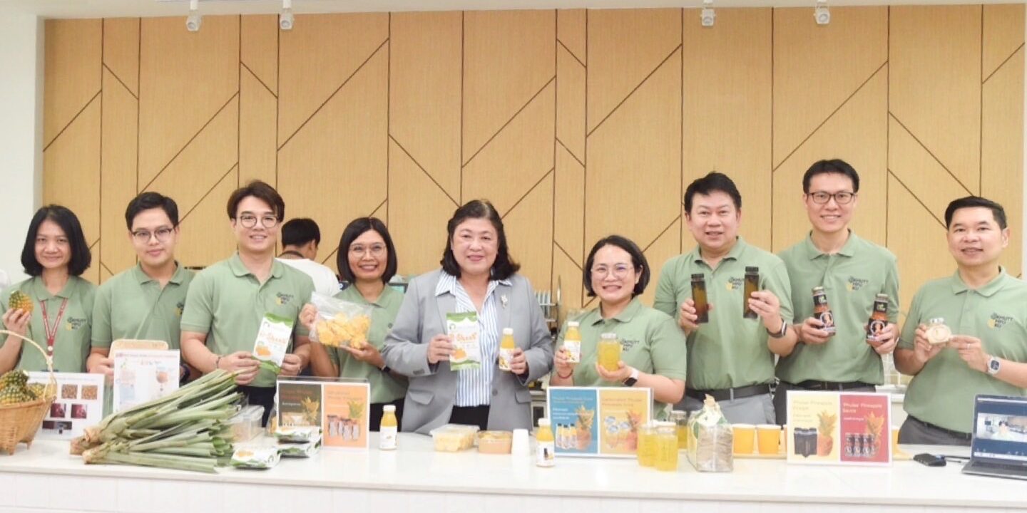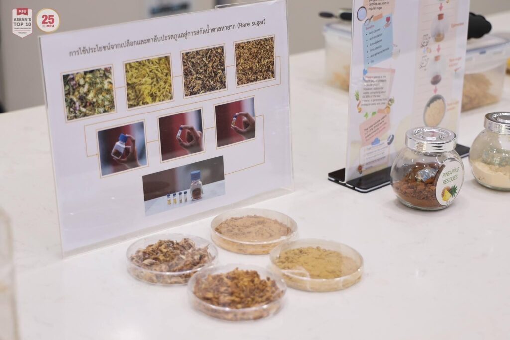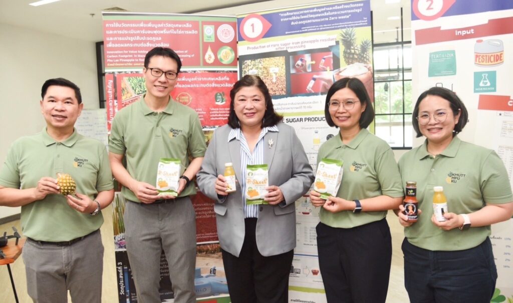 รศ.ดร.วาริช ศรีละออง และ รศ.ดร.อนรรฆ ขันธะชวนะ จาก มจธ.,ผศ. ดร.พันธ์สิริ สุทธิลักษณ์ และ ผศ. ดร.สุทธิวัลย์ สีทา จากม.แม่ฟ้าหลวง และ ผศ. ดร.สอนกิจจา บุญโปร่ง จาก ม.เกษตรศาสตร์ พร้อมด้วยทีมคณะนักวิจัย ได้ร่วมกันนำเสนอความก้าวหน้าและผลสำเร็จ จากการวิจัยและการศึกษาการใช้ประโยชน์จากวัสดุเศษเหลือและศึกษาการปลดปล่อยคาร์บอนในการผลิตสับปะรดภูแลในเขตจังหวัดเชียงราย ที่เป็นสินค้า GI ของจังหวัดเชียงราย มียอดสั่งซื้อจากต่างประเทศ ทั้งในรูปของผลสด ผลปอกเปลือกหรือตัดแต่งก่อนส่งออกติดต่อกันทุกปี จนทำให้ปัจจุบัน มีพื้นที่ปลูกสับปะรดชนิดนี้ในจังหวัดเชียงราย มากกว่า 5 หมื่นไร่ มีผลผลิตมากกว่าหนึ่งแสนตันต่อปี จึงได้นำกระบนการในการสร้างมูลค่าเพิ่มจากของวัสดุเศษเหลือในกระบวนการผลิต และเพื่อให้ได้ตัวเลขการปล่อยก๊าซเรือนกระจกของผลิตภัณฑ์สับปะรดภูแล ซึ่งได้รับการสนับสนุนทุนวิจัยจาก วช. เพื่อศึกษาเศษเหลือใช้จากสับปะรดในการเพิ่มมูลค่า โดยนำตาของสับปะรดที่มีน้ำตาล glucose fructose และ sucrose เป็นหลัก โดยสามารถเปลี่ยนน้ำตาล fructose จากเปลือกและตาสับปะรดไปเป็น D – allulose หรือน้ำตาลหายาก เป็นสารให้ความหวาน ที่นิยมใช้ในอุตสาหกรรมอาหารสุขภาพ อีกทั้งลดการปล่อยก๊าซเรือนกระจก โดยใช้ประโยชน์วัสดุเศษเหลือในกระบวนการแปรรูปสับปะรดภูแลตามแนวทาง Zero waste ซึ่งมีเป้าหมายหลักเพื่อสร้างความตระหนักให้กับเกษตรกรหรือผู้ประกอบการเกี่ยวกับผลกระทบต่อสิ่งแวดล้อมที่มีผลกับอุตสาหกรรมในภาพรวม