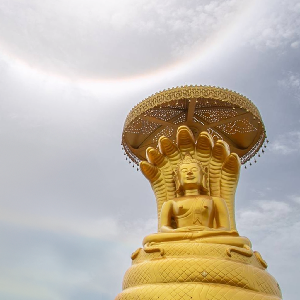 เพราะ ‘หลวงพ่อเจ็ดกษัตริย์’ ท่านเป็นสัญลักษณ์ของหยาดฝน ความอุดมสมบูรณ์ รวมถึงความร่มเย็นเป็นสุข มีพุทธลักษณะเป็นพระพุทธรูปโบราณปางสมาธิ ประทับนั่งบนขดหางของพญางู 7 องค์ เหนือพระเศียรมีพญางูทั้งเจ็ดชูคอแผ่พังพาน ปกป้องคุ้มครององค์