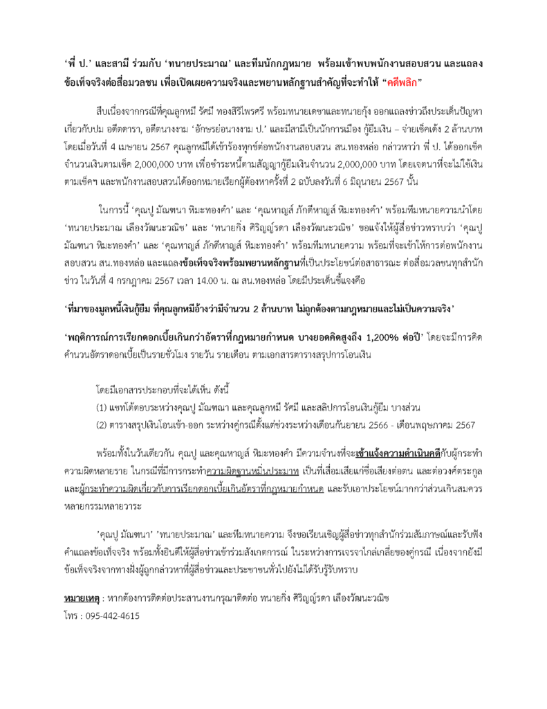 ในการนี้ ‘คุณปู มัณฑนา หิมะทองคำ’ และ ‘คุณหาญส์ ภักดีหาญส์ หิมะทองคำ’ พร้อมทีมทนายความนำโดย ‘ทนายประมาณ เลืองวัฒนะวณิช’ และ ‘ทนายกิ่ง ศิริญญ์รดา เลืองวัฒนะวณิช’ ขอแจ้งให้ผู้สื่อข่าวทราบว่า ‘คุณปู มัณฑนา หิมะทองคำ’ และ ‘คุณหาญส์ ภักดีหาญส์ หิมะทองคำ’ พร้อมทีมทนายความ พร้อมที่จะเข้าให้การต่อพนักงานสอบสวน สน.ทองหล่อ และแถลงข้อเท็จจริงพร้อมพยานหลักฐานที่เป็นประโยชน์ต่อสาธารณะ ต่อสื่อมวลชนทุกสำนักข่าว ในวันที่ 4 กรกฎาคม 2567 เวลา 14.00 น. ณ สน.ทองหล่อ