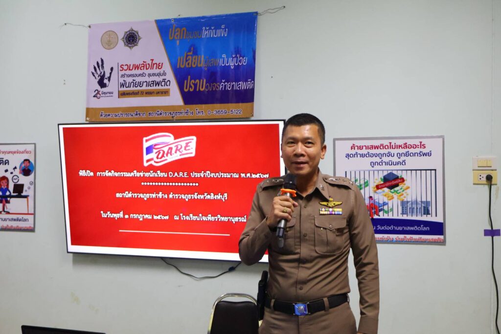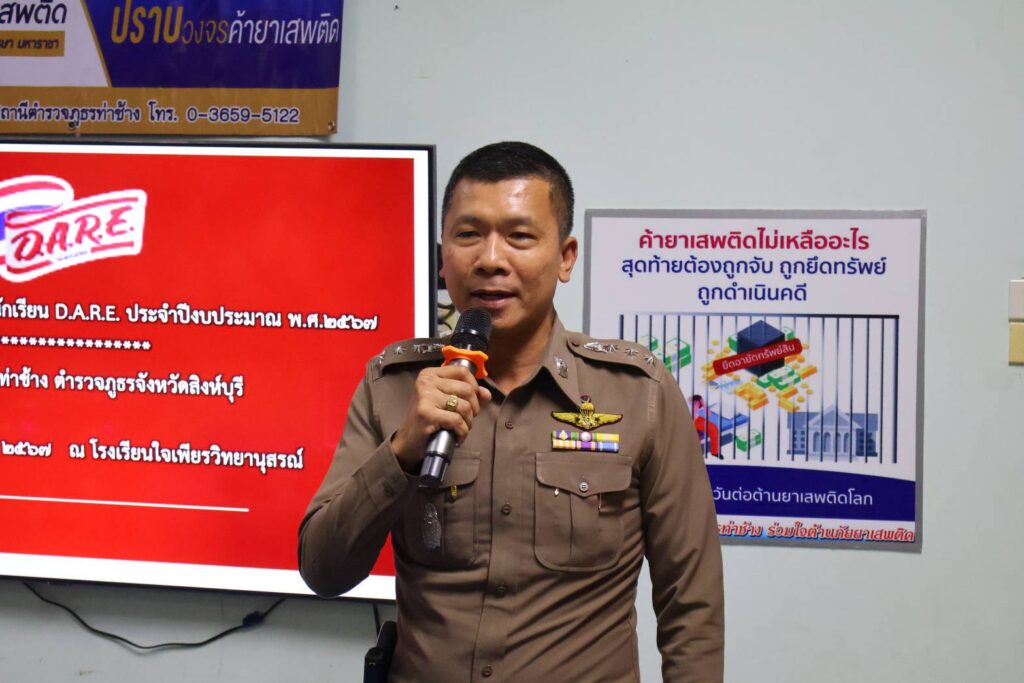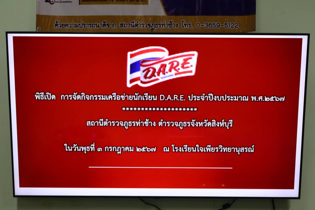 วันที่ 3 กรกฎาคม 2567 สถานีตำรวจภูธรท่าช้าง จังหวัดสิงห์บุรี ได้จัดกิจกรรมเครือข่ายนักเรียน D.A.R.E. ประจำปีงบประมาณ พ.ศ.2567 ณ โรงเรียนใจเพียรวิทยานุสรณ์ ตำบลถอนสมอ อำเภอท่าช้าง จังหวัดสิงห์บุรี โดยมี พันตำรวจโท สุเทพ พวงทอง สารวัตรป้องกันปราบปราม สถานีตำรวจภูธรท่าช้าง เป็นผู้กล่าวรายงาน มี นายภากรณ์ ใจเพียร ผู้อำนวยการโรงเรียนใจเพียรวิทยานุสรณ์ เป็นประธานเปิดงาน และมี พันตำรวจเอก สราวุฒิ ปรีดาภรณ์ ผู้กำกับการสถานีตำรวจภูธรท่าช้าง เป็นผู้ให้โอวาทกับนักเรียน