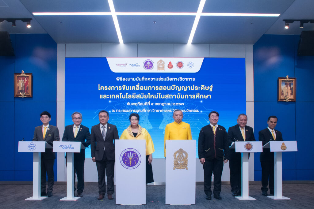 วันที่ 4 กรกฎาคม 2567 ห้องแถลงข่าวชั้น 1 อาคารพระจอมเกล้า กระทรวงการอุดมศึกษา วิทยาศาสตร์ วิจัยและนวัตกรรม (อว.): กระทรวงการอุดมศึกษา วิทยาศาสตร์ วิจัยและนวัตกรรม โดย สำนักงานพัฒนาวิทยาศาสตร์และเทคโนโลยีแห่งชาติ (สวทช.) ร่วมกับ กระทรวงศึกษาธิการ โดย สำนักงานคณะกรรมการการศึกษาขั้นพื้นฐาน (สพฐ.) สำนักงานคณะกรรมการการอาชีวศึกษา (สอศ.) และสถาบันส่งเสริมการสอนวิทยาศาสตร์และเทคโนโลยี (สสวท.) ลงนามบันทึกความร่วมมือทางวิชาการ “โครงการขับเคลื่อนการสอนปัญญาประดิษฐ์และเทคโนโลยีสมัยใหม่ในสถาบัน การศึกษา” เพื่อสร้างผู้สอน นักเรียนทุกคน ทุกช่วงชั้น ให้มีความรู้ด้าน AI มีความเข้าใจและตระหนัก เรื่องจริยธรรมของการนำไปใช้ประโยชน์ (ethical considerations) เพื่อเตรียมพร้อมสู่การเป็นพลเมืองดิจิทัล และรองรับตลาดแรงงานสมัยใหม่แห่งศตวรรษที่ 21 โอกาสนี้ พลตำรวจเอกเพิ่มพูน ชิดชอบ รัฐมนตรีว่าการกระทรวงศึกษาธิการ (ศธ.) และ นางสาวศุภมาส อิศรภักดี รัฐมนตรีว่าการกระทรวงการอุดมศึกษา วิทยาศาสตร์ วิจัยและนวัตกรรม (อว.) ได้กล่าวแสดงความยินดีและมอบนโยบายที่เกี่ยวข้อง