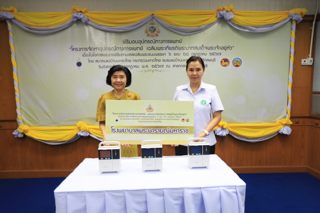 ในโอกาสนี้ ชมรมแม่บ้านมหาดไทยจังหวัดลพบุรีได้รับมอบเครื่องควบคุมการให้สารละลายทางหลอดเลือดดำ จำนวน 3 เครื่อง จากสมาคมแม่บ้านมหาดไทย เพื่อส่งมอบให้กับโรงพยาบาลพระนารายณ์มหาราช ซึ่งเป็นโรงพยาบาลตามกลุ่มเป้าหมายของสมาคมแม่บ้านมหาดไทย เพื่อเพิ่มศักยภาพโรงพยาบาลในการให้การรักษาผู้ป่วยได้อย่างมีประสิทธิภาพ โดยหวังเป็นอย่างยิ่งว่าอุปกรณ์ทางการแพทย์ที่ทางสมาคมแม่บ้านมหาดไทยมอบให้แก่โรงพยาบาล จะอำนวยประโยชน์สาธารณะในการให้ความช่วยเหลือประชาชนสมดังวัตถุประสงค์ของโครงการทุกประการ