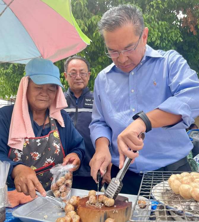 นายกต้น ลงมือย่างไส้กรอกอีสานสูตรโบราณ ทั้งย่างเองด้วยมือตนเองและชิมเอง กระซิบกับใกล้ๆหู นายนันท์นภัส ลิ้มนุสนธิ์ ผู้อำนวยการ ศูนย์ข่าว ภาคกลางหนังสือพิมพ์ 5 เหล่าทัพ บอกว่าเอาหล่อจริงๆ ไม่รอช้าท่านนายกต้น ยื่นให้กับทีมข่าวได้ชิมบอกเสียงเดียวกันเลยว่าเอาอร่อยจริงๆคำร่ำลือ
