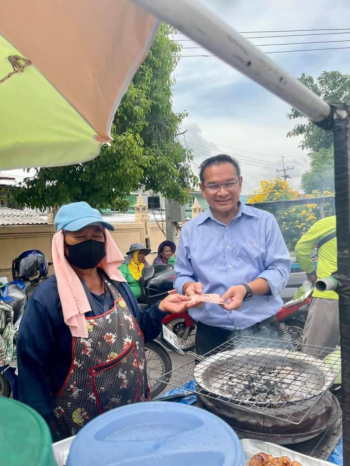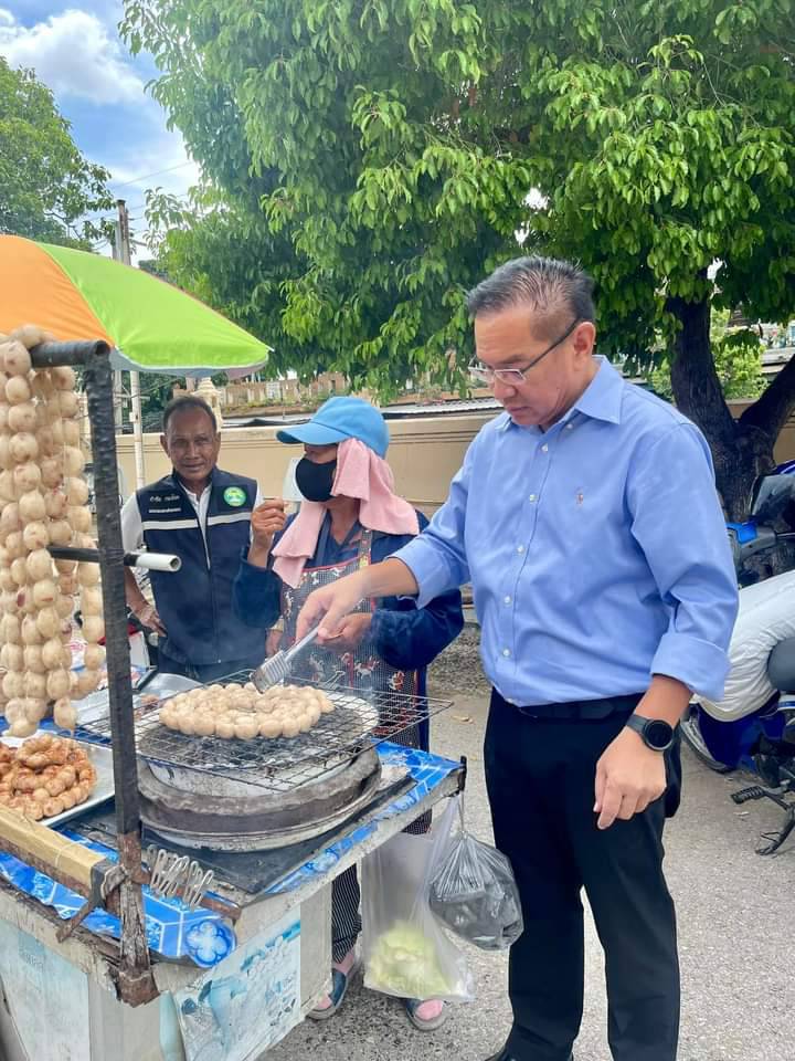 นายพูลสวัสดิ์ ถือคง นายกเทศมนตรีตำบลเขาพระงาม นายกขวัญใจตำบลเขาพระงามพาคณะพวกเราไปพิสูจน์ความอร่อย ก็คือไส้กรอกอีสานสูตรโบราณ มาขายเป็นรถเข็นแบบบ้านๆ