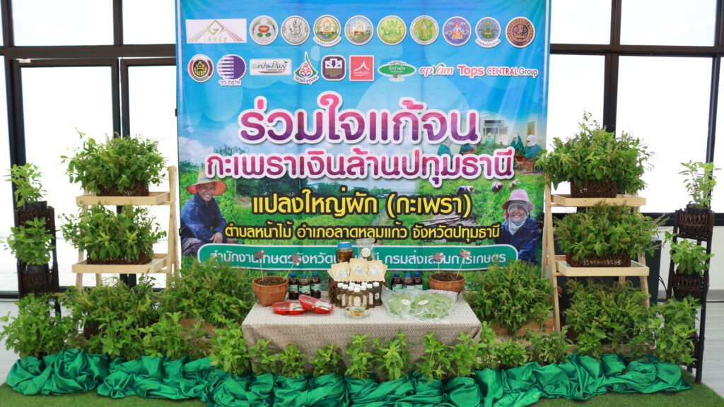 นางศศิธร ชาญประเสริฐ เกษตรจังหวัดปทุมธานี เปิดเผยว่า การดำเนินงานร่วมใจแก้จนกะเพราเงินล้านปทุมธานี เริ่มต้นจากเกษตรกรได้ปลูกกะเพราสายพันธุ์ทั่วไปเป็นอาชีพจากนั้นได้รวมตัวกันจดทะเบียนวิสาหกิจชุมชนกลุ่มส่งเสริมการผลิตผักปลอดภัยจากสารพิษตำบลหน้าไม้และได้มีแนวคิดในการพัฒนาคุณภาพ สร้างอัตลักษณ์ให้แก่กะเพราตำบลหน้าไม้ โดยปรับเปลี่ยนจากกะเพราสายพันธุ์ทั่วไป เป็นกะเพราป่า เพราะกะเพราป่าที่มีกลิ่นหอม เป็นเอกลักษณ์เฉพาะตัว และมีกระบวนการผลิตที่ปลอดภัยและได้รับการรับรองมาตรฐาน GAP เป็นที่เชื่อมั่นของผู้บริโภคและเป็นที่ต้องการของตลาดเพิ่มขึ้นจากการดำเนินกระบวนการผลิตที่ปลอดภัย เกษตรกรได้ร่วมกันยกระดับมาตรฐานการผลิตและสร้างมูลค่าเพิ่มให้กับกะเพรา โดยสร้างโรงเรือนคัดแยกผลผลิตที่ได้มาตรฐาน และรวมกลุ่มเป็นแปลงใหญ่ผักตำบลหน้าไม้ ปัจจุบันมีสมาชิกจำนวน 31 ราย พื้นที่ 220 ไร่ ซึ่งมีการดำเนินงานตามเป้าหมายของแปลงใหญ่ 5 ด้าน ได้แก่ ลดต้นทุนการผลิต เพิ่มประสิทธิภาพการผลิต เพิ่มคุณภาพผลผลิต จนบรรลุตามเป้าหมาย สามารถลดต้นทุนการผลิตร้อยละ 21.5 เพิ่มผลผลิตร้อยละ 8.3 และกะเพราของตำบลหน้าไม้เป็นที่ยอมรับ