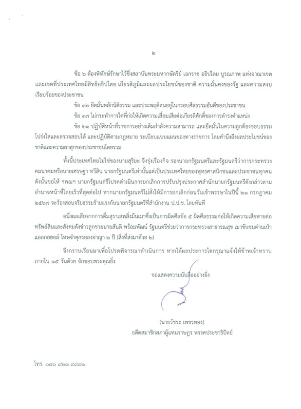 เรื่อง ขอคัดค้านนายสุริยะ จึงรุ่งเรืองกิจ รองนายกรัฐมนตรีและรัฐมนตรีว่าการกระทรวงคมนาคม ในฐานะประธานที่ประชุมคณะกรรมการนโยบายเครื่องดื่มแอลกอฮอล์แห่งชาติ ให้จำหน่ายเครื่องดื่มแอลกอฮอล์ในวันพระใหญ่ที่อาคารอากาศยานนานาชาติและสถานีรถไฟรวมถึงขบวนรถไฟ