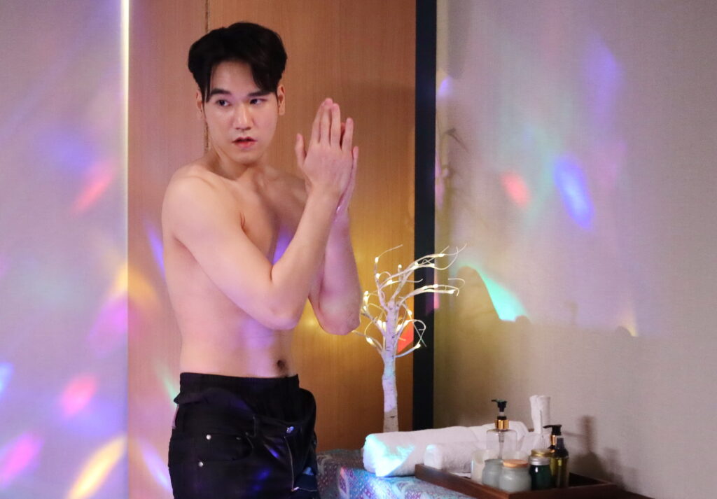 พอการซักซ้อมเสร็จเข้าใจกันแล้ว ผู้กำกับฯ ก็สั่งเคลื่อนกล้อง บอนไซ บอกให้ เนสท์ เปลี่ยนชุดแต่ เนสท์ บอกหานวดแบบไม่ต้องเปลี่ยนก็ได้ แล้วทั้งคู่ก็แสดงไปตามบท เนสท์ ถูกพามานอนที่เตียงจากนั้น บอนไซ ก็ถอดเสื้อโชว์กล้ามแน่นๆ พร้อมทั้งถอดกางเกง เอาน้ำมาทาแขนก่อนจะมาถูที่แขน เนสท์ ด้วยแอคติ้งเป็นเลิศของ บอนไซ ทำเอา เนสท์ ถึงกับหลุดขำเลยต้องเทค ก่อนจะถ่ายกันต่อที่ไปจนถึง เนสท์ เปลี่ยนจากคนถูกนวดมาสอนนวดกษัยที่ถูกต้องให้ บอนไซ แทน ซึ่ง เนสท์ ก็เป๊ะมากปากก็พูดตามบทมือก็นวดไป ผู้ช่วยหน้าฉากให้สัญญาณ คิมม่อน ก็เข้ามาตกใจกับภาพที่เห็นก่อนที่จะดึงตัว เนสท์ ออกไป เสียงคัทดังขึ้นพร้อมกับเสียงหัวเราะของนักแสดงและทีมงาน ต่างชมว่า บอนไซ แสดงได้ฮามาก เชื่อว่าจะเรียกรอยยิ้มจากคนดูได้แน่
