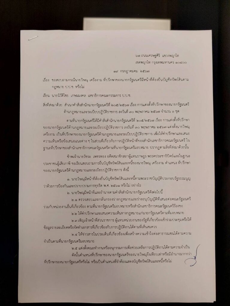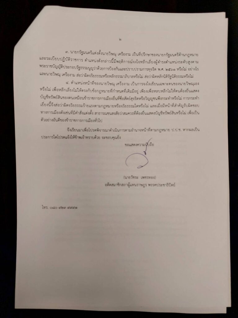 วันนี้ (19ก.ค.) นายวัชระ เพชรทอง อดีตสมาชิกสภาผู้แทนราษฎร พรรคประชาธิปัตย์ ได้ยื่นหนังสือถึงทาง นายนิวัติไชย เกษมมงคล เลขาธิการคณะกรรมการ ป.ป.ช. เรื่อง ขอสอบถามกรณีนายวิษณุ เครืองาม ที่ปรึกษาของนายกรัฐมนตรีมีหน้าที่ต้องยื่นบัญชีทรัพย์สินตามกฎหมาย ป.ป.ช. หรือไม่ โดยมีเนื้อหาดังนี้