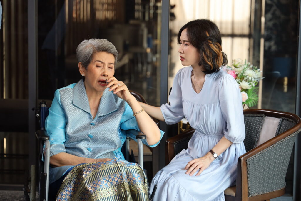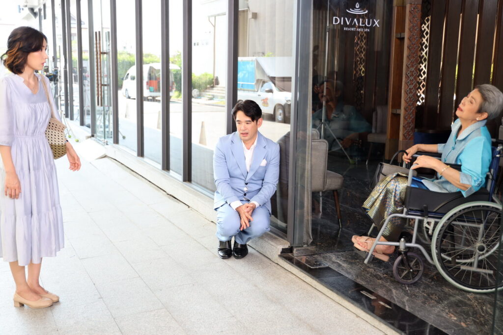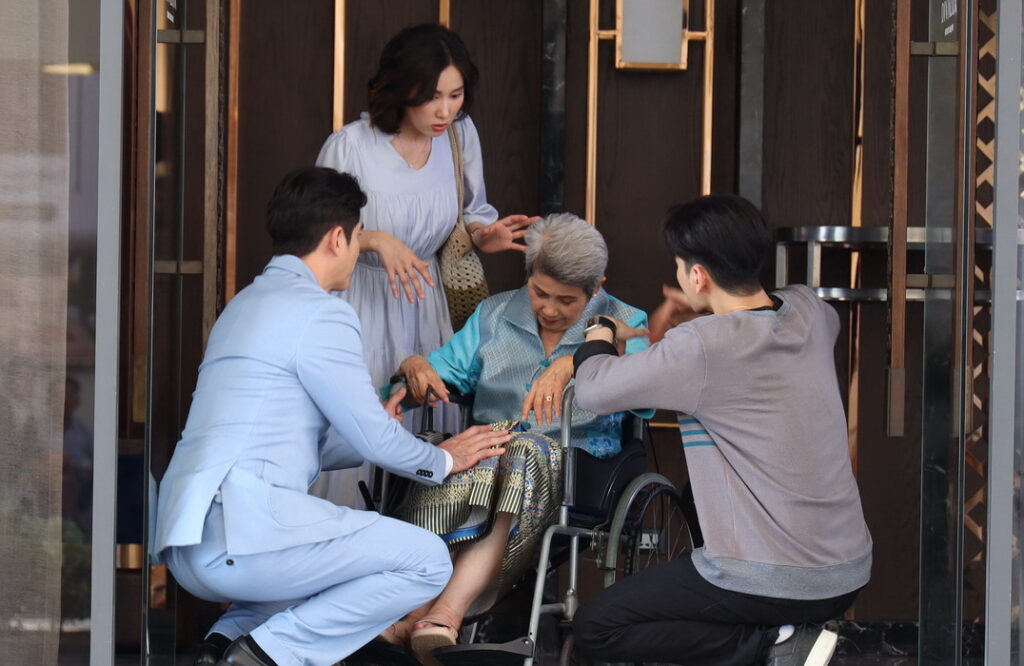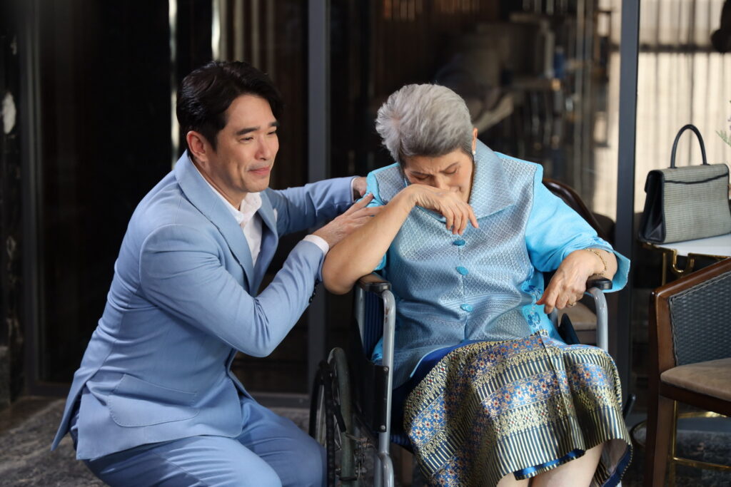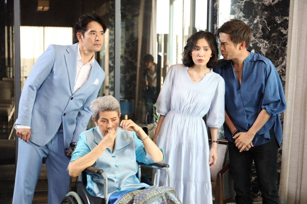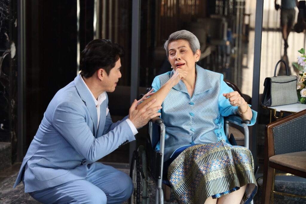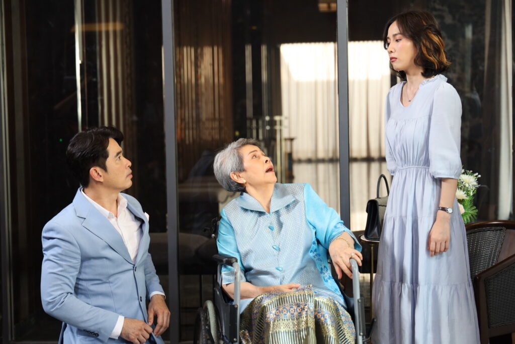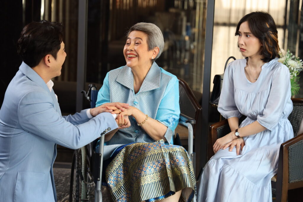 จากนั้นมาต่อกันด้านในโรงแรม เป็นฉากต่อเนื่อง ลิฟท์ บอกจะไปรักษาอาการป่วย และขอโอกาสอีกครั้ง จู่ ๆ โอ, คิมม่อน และมิ้ม ก็โผล่เข้ามา บอกความจริงกับ เนสท์ ว่า อาโย แกล้งป่วยเพื่ออยากให้ ยาใจ แต่งงาน ก็ทำเอาหลานน้อยใจที่โดนหลอก ซึ่งเช่นเคยก่อนถ่ายผู้กำกับ ก็ให้เหล่านักแสดงซ้อม พร้อมกล้อง เพราะต้องรู้จังหวะที่ทั้งสามนักแสดงเปิดประตูเข้ามา หลังจากที่ซ้อมจนเข้าใจกัน และบทไม่ติดขัด เสียงแอ็กชั่น ก็ดังขึ้น นักแสดงทุกคนเล่นไปตามที่ซ้อม แม้ฉากนี้ต้องใช้เวลาถ่ายอยู่นานเป็นชั่วโมงความที่ต้องเปลี่ยนมุมภาพ และถ่ายเจาะเหล่านักแสดง แต่สุดท้ายก็ผ่านฉลุยไม่มีเทคความที่เป็นมืออาชีพกันเกือบทุกคน