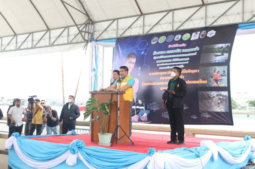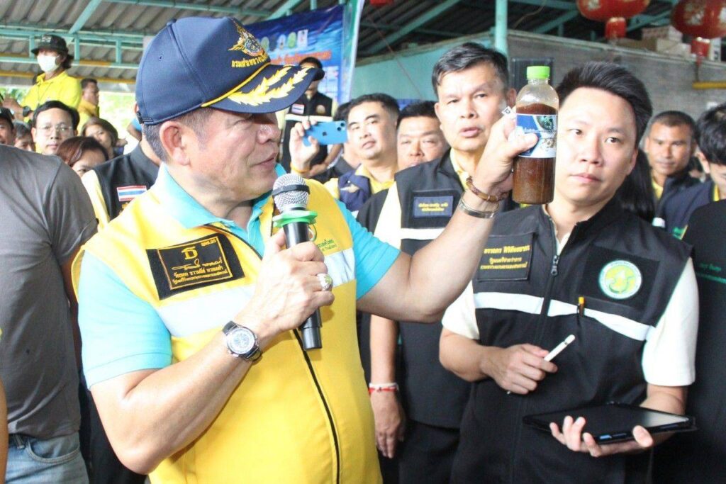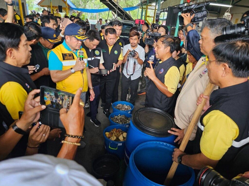 เมื่อวันจันทร์ที่ 22 กรกฎาคม 2567 เวลา 13.00 น. ณ สมาคมการประมงสมุทรสาคร อำเภอเมือง จังหวัดสมุทรสาคร ร้อยเอก ธรรมนัส พรหมเผ่า รัฐมนตรีว่าการกระทรวงเกษตรและสหกรณ์ พร้อมด้วย นายอรรถกร ศิริลัทธยากร รัฐมนตรีช่วยว่าการกระทรวงเกษตรและสหกรณ์ นายบัญชา สุขแก้ว อธิบดีกรมประมง และผู้บริหารกระทรวงเกษตรและสหกรณ์ ร่วมลงพื้นที่จังหวัดสมุทรสาครในการประชุมหารือร่วมกับผู้แทนสมาคมการประมง 16 จังหวัดที่ได้รับผลกระทบจากการแพร่ระบาดของปลาหมอคางดำเพื่อหาแนวทางการแก้ไขปัญหาร่วมกัน พร้อมร่วมสังเกตการณ์ขั้นตอนการรับซื้อปลาหมอคางดำ ณ จุดรับซื้อจริง และชมการสาธิตการทำน้ำหมักชีวภาพจากปลาหมอคางดำโดยกรมพัฒนาที่ดิน