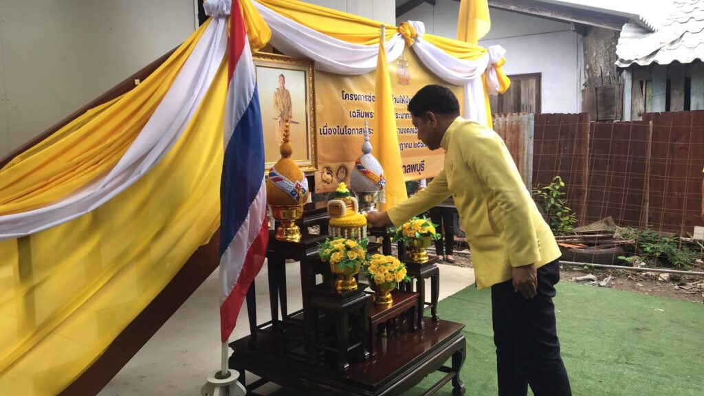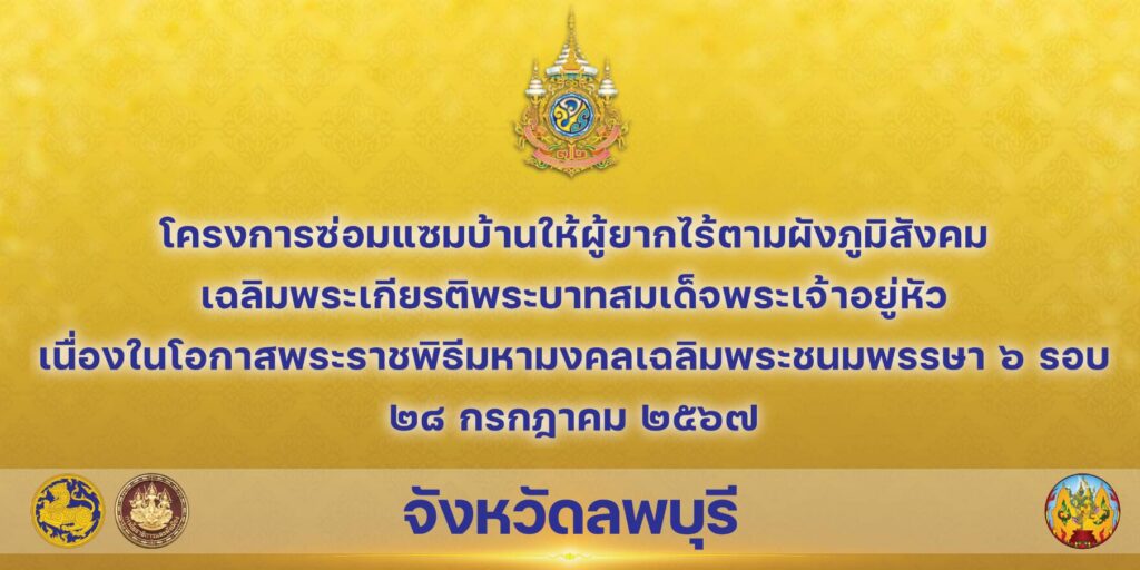 วันพุธที่ 24 กรกฎาคม 25 67 นายอำพล อังคภากรณ์กุล ผู้ว่าราชการจังหวัดลพบุรี ได้มอบหมายให้ นายวชิระ เกตุพันธุ์ รองผู้ว่าราชการจังหวัดลพบุรี พร้อมด้วย นายพิษณุ ประภาธนานันท์ ปลัดจังหวัดลพบุรี นางชนิตตา แสงพลบ โยธาธิการและผังเมืองจังหวัดลพบุรี หัวหน้าส่วนราชการระดับจังหวัด ระดับอำเภอ เหล่ากาชาดจังหวัดลพบุรี ชมรมแม่บ้านมหาดไทย เทศบาลตำบลโคกตูม กำนันตำบลโคกตูม ผู้นำชุมชน บริษัท ห้างร้าน ภาคีเครือข่าย ผู้ประกอบการ และประชาชนทั่วไปในพื้นที่ รวมทั้งสิ้นประมาณ 80 คน ร่วมกันส่งมอบบ้านในโครงการซ่อมแซมบ้านให้ผู้ยากไร้ตามผังภูมิสังคม โครงการเฉลิมพระเกียรติพระบาทสมเด็จพระเจ้าอยู่หัว เนื่องในโอกาสมหามงคลเฉลิมพระชนมพรรษา 6 รอบ 28 กรกฎาคม 2567 และเครื่องอุปโภคบริโภคแก่นางสาวแพนเทพ อุทธา อาศัยอยู่บ้านเลขที่ 121/3 หมู่ที่ 2 ตำบลโคกตูม อำเภอเมืองลพบุรี จังหวัดลพบุรี โดยมี นายอนุทิน ชาญวีรกูล รองนายกรัฐมนตรีและรัฐมนตรีว่าการกระทรวงมหาดไทย เป็นประธานในพิธีผ่านระบบ Vedeo conference จากห้องประชุมนริศรานุสรณ์ ชั้น 11 อาคาร 11 ชั้น กรมโยธาธิการและผังเมือง