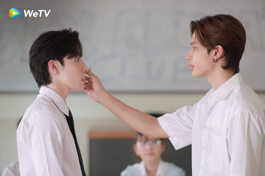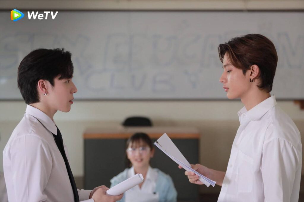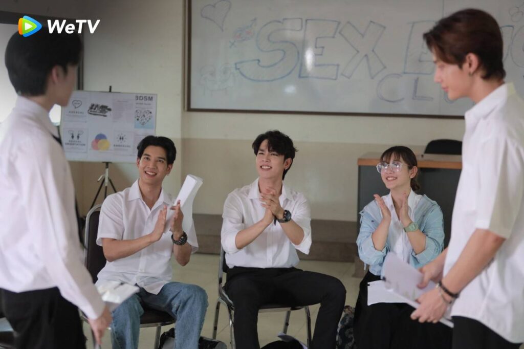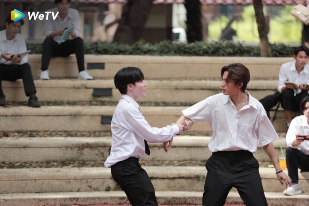 แหมๆๆๆ ก่อนจะไปชมภาพจูบปากของสองหนุ่มละมุนๆ กันแบบนี้ เรามีภาพเบื้องหลังมาเรียกน้ำย่อยกันก่อน ซึ่งแน่นอนว่าฉากต่อบทนิยายวายนั้น ทีมงานและผู้กำกับฯ ใช้สถานที่ถ่ายทำในห้องเรียนของมหาวิทยาลัยแห่งหนึ่ง ซึ่งการถ่ายทำนั้นก็มีการซักซ้อมกันก่อน เพราะบทก็ค่อนข้างยาว แต่นักแสดงแต่ละคนก็ทำการบ้านมาอย่างดี โดยเฉพาะ เจ้านาย กับ โนเกีย ต้องต่อบทกันแบบจะๆ คำต่อคำ แถมยังต้องมีอารมณ์แบบพ่อแง่แม่งอน จนเกือบมีปากเสียง เดือดร้อนเพื่อนๆ ที่ต้องช่วยกันห้าม!! แต่แผนของ สาวลูกพีช ก็ได้ผล เพราะทั้งคู่ก็เริ่มเปิดใจใส่ไดอะล็อกนอกบทกันแล้วนะจ้ะ!!!